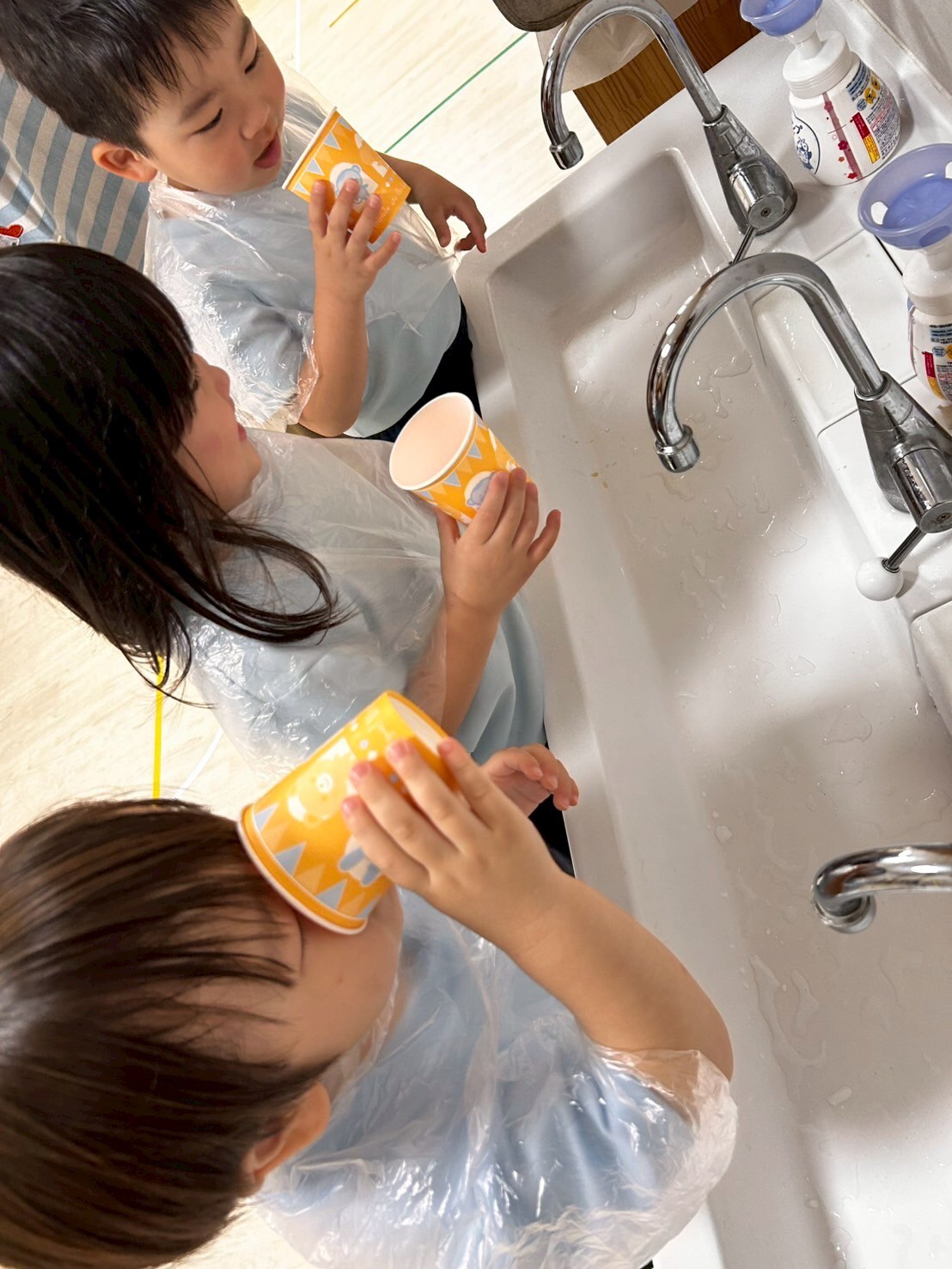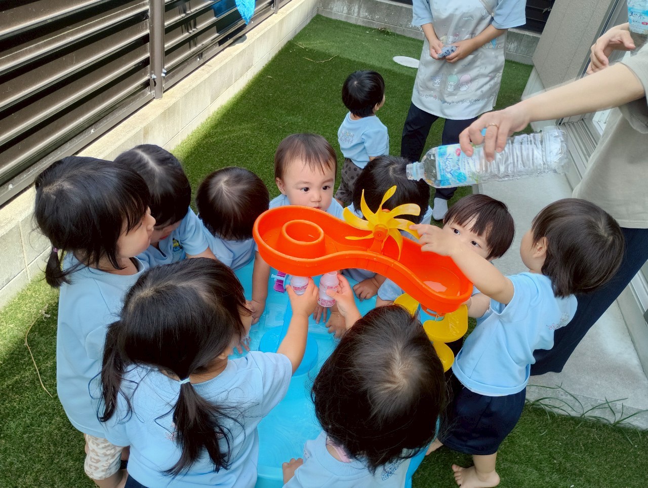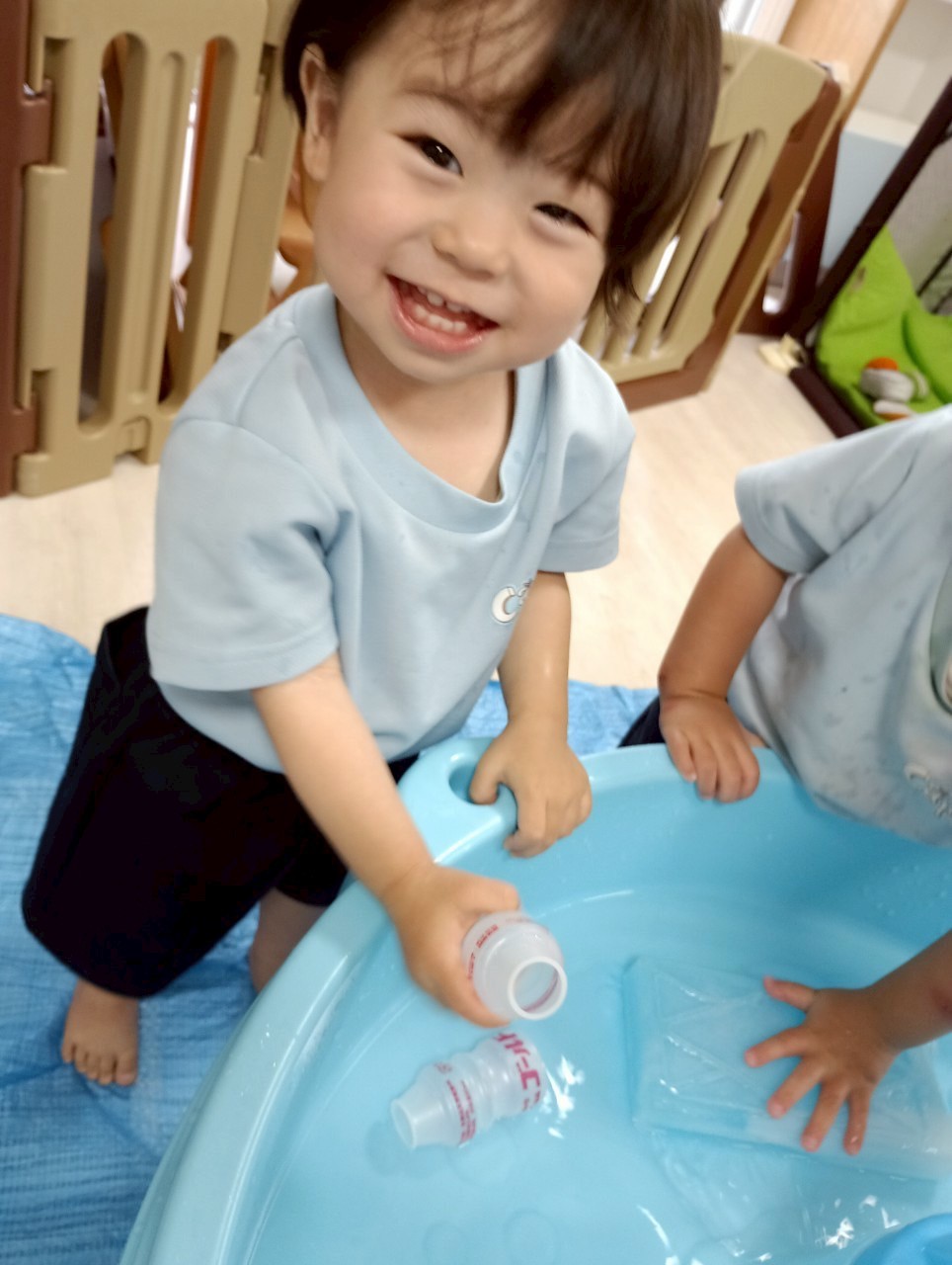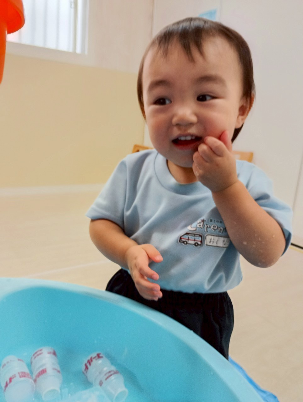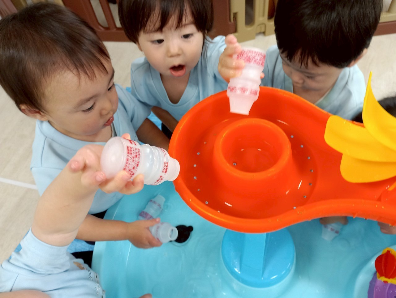 その間に水遊びを楽し見ましたよ🚿容器に水を入れて運んだり上から落ちてくる水を見てキャキャー喜んでいました❤️水遊びが待ち遠しいですね🎶【うさぎ・こあら・きりんぐみ】