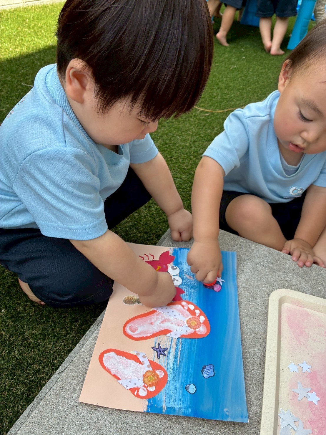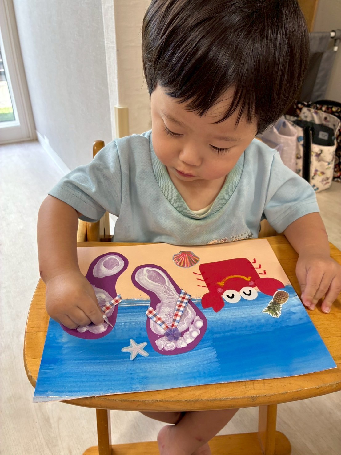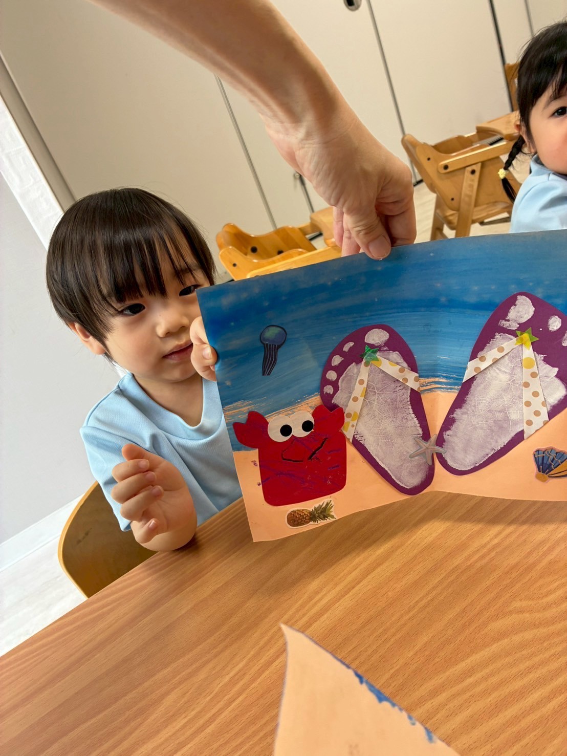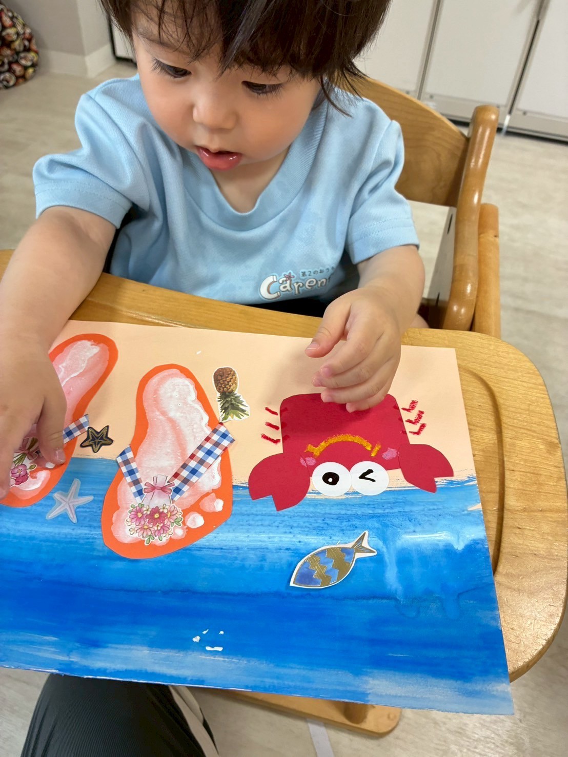 先日作ったサンダルに飾りのシールを貼りましたよ🌺周りにヒトデやクラゲ、パイナップルを飾って完成しました🩷夏先取りの子どもたちです🍍💕