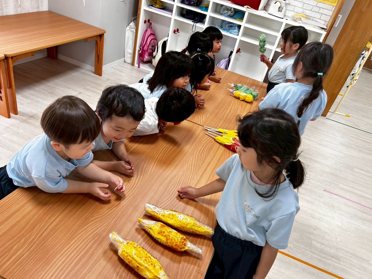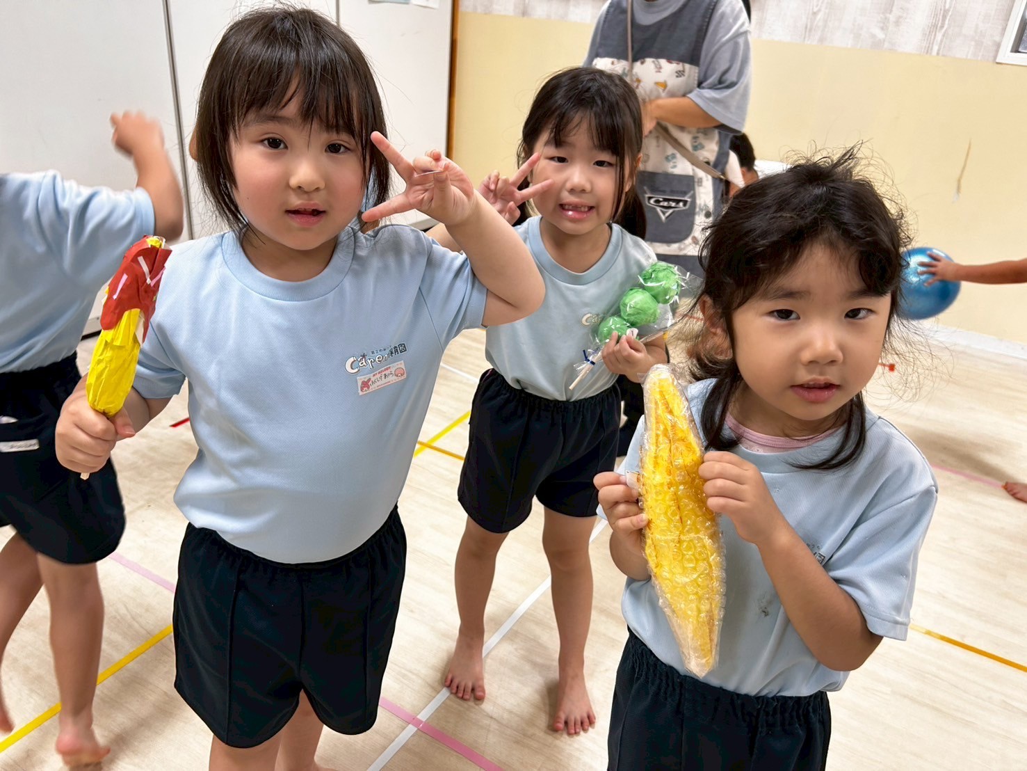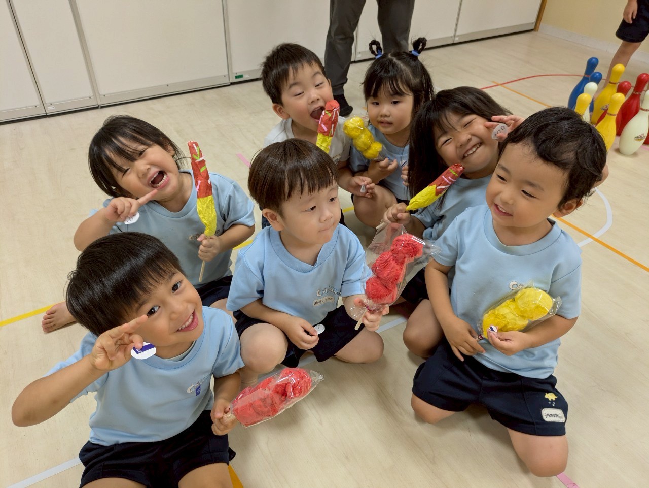 レッスンの後はお店屋さんごっこ❣️チョコバナナ、フルーツ飴、焼きとうもろこし、ボーリングと100円を握りしめてまわりましたよ💕きりんさんは看板づくりもして「いらっしゃいませ〜🎶」と盛り上がっていました🥰