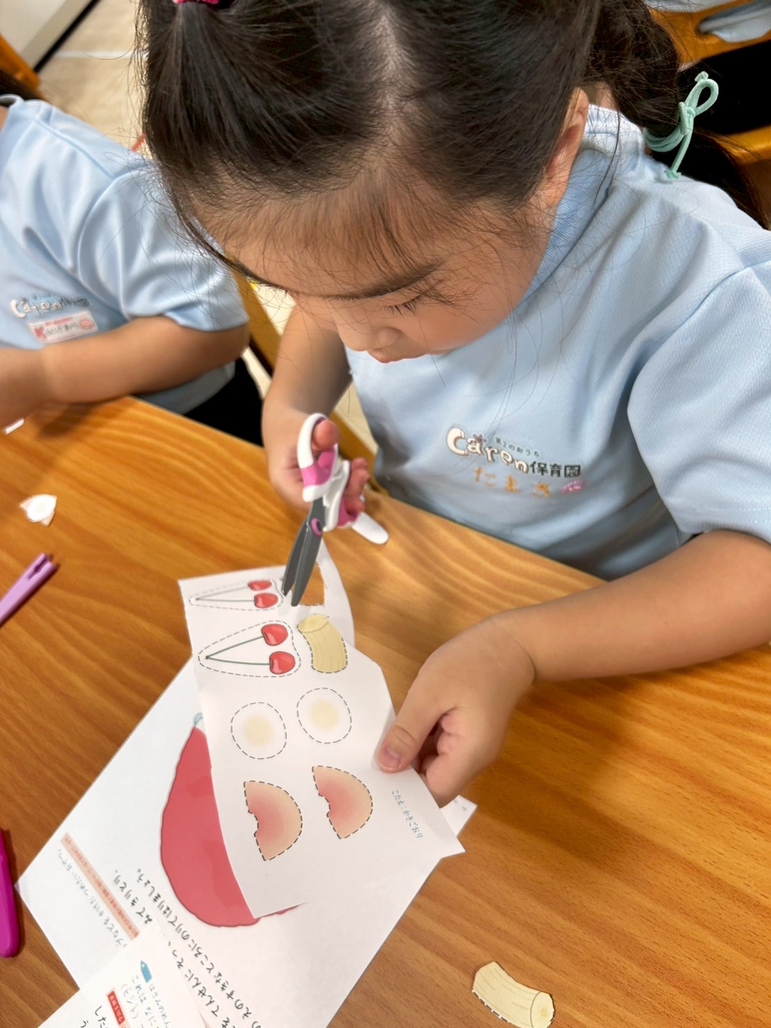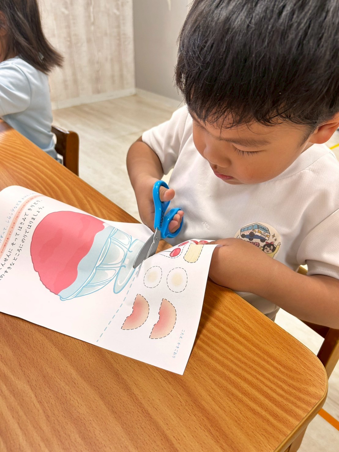 今日はきりんこあらさんは、ハサミ練習プリント✂️うさぎ組さんはシール貼りと塗り絵のプリントをしました🌟はさみ練習では、個人差はありますが、みんな切るのが上手になってきて点線に沿ってのカーブも綺麗になってきました✨うさぎ組さんもシールを貼る部分と色を塗る部分が分かってこだわりを持ちながら進めていましたよ☺️製作意欲の強いきりんこあらさんは、自分のプリントが終わった後にシール貼りのプリントまでやっていましたよ🥰みんな持ち帰ってお家の方に褒めてもらうのを楽しみに製作していたので沢山褒めてあげてくださいね💖