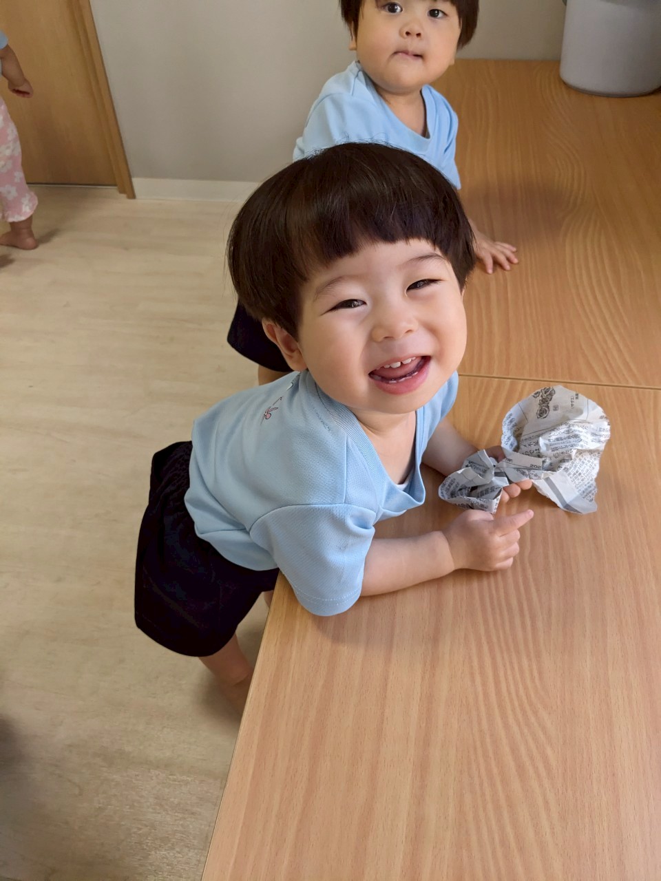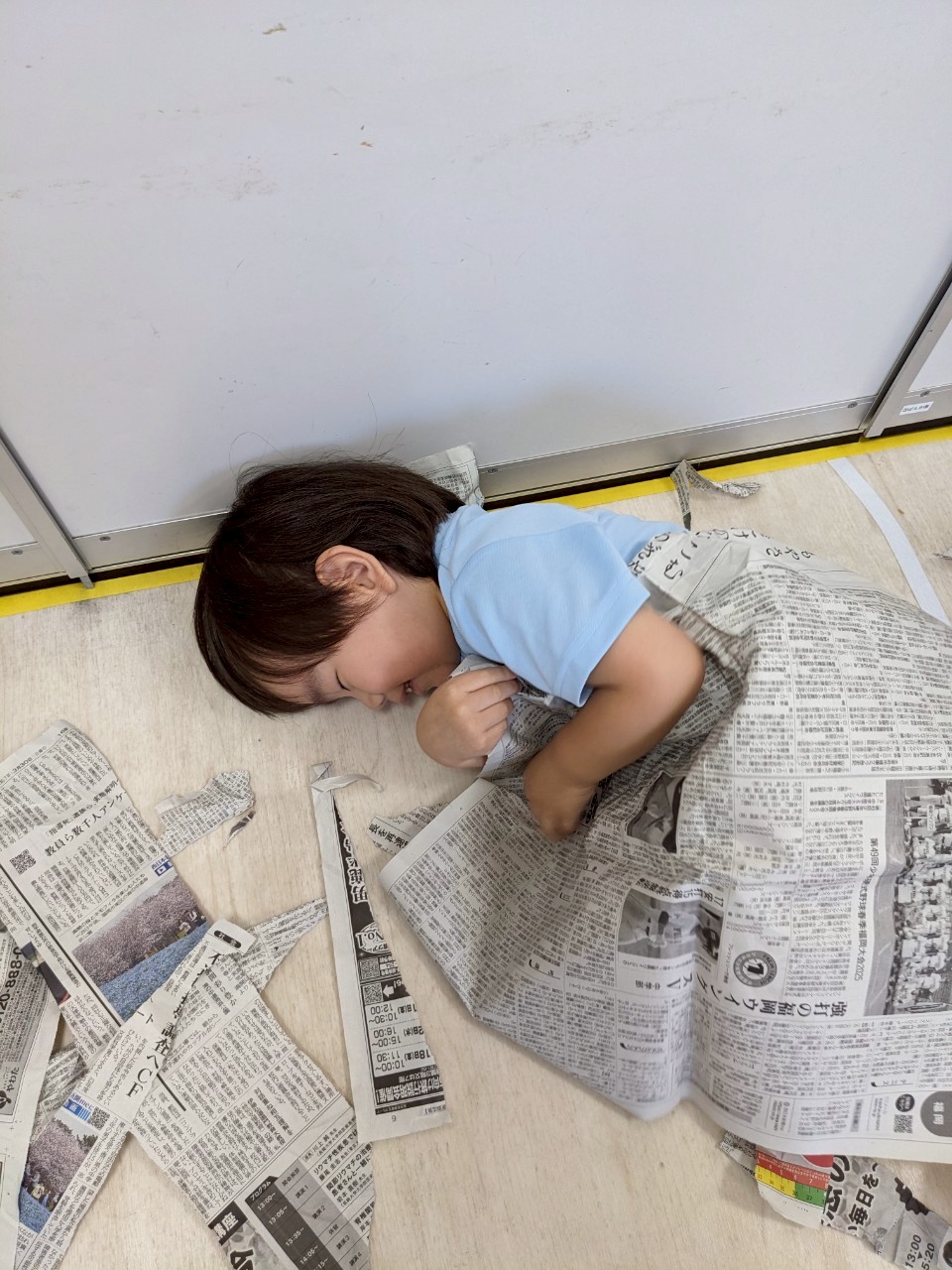 その後は新聞紙を使って遊びました😊大きなボールを作って投げる子や、細くちぎって破れる感触や音を楽しむ子、新聞紙の上を歩いて楽しむなど、それぞれ楽しさを見つけて遊びました✨✨