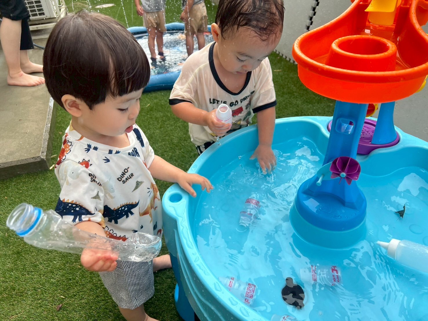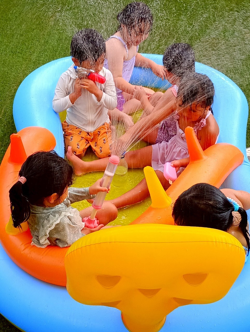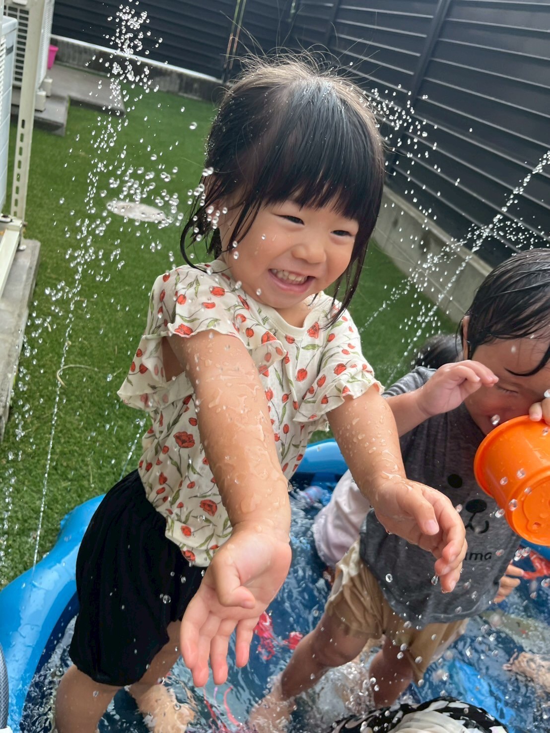 お天気が心配だったのですが、小雨!止む!の繰り返しだったので大好きな水遊びをしました❣️今日は噴水タイプのプールもあり子どもたち大興奮💛