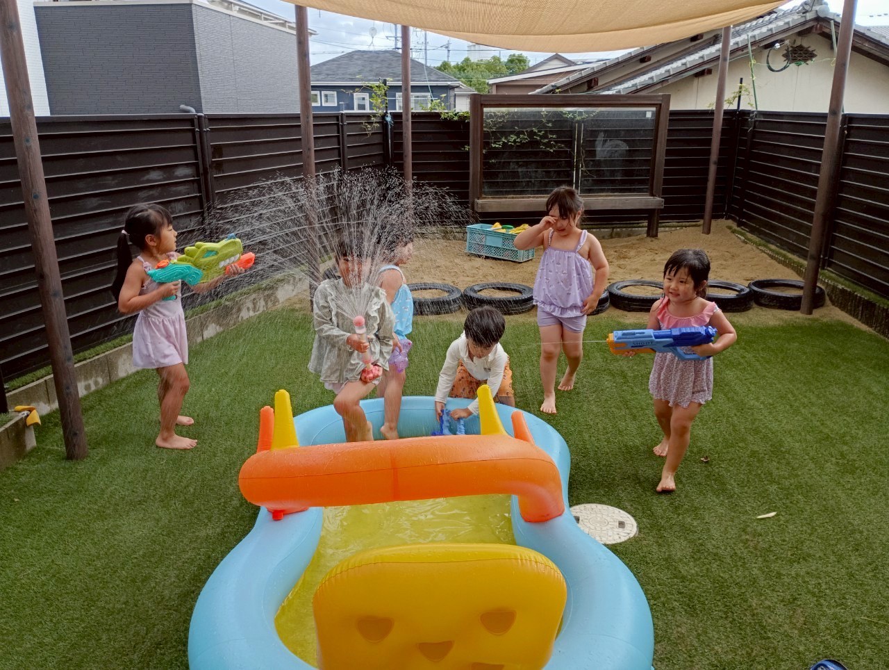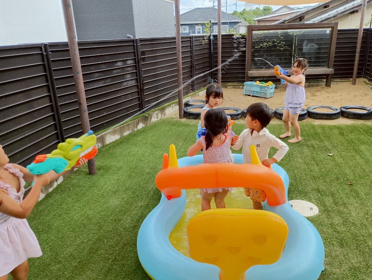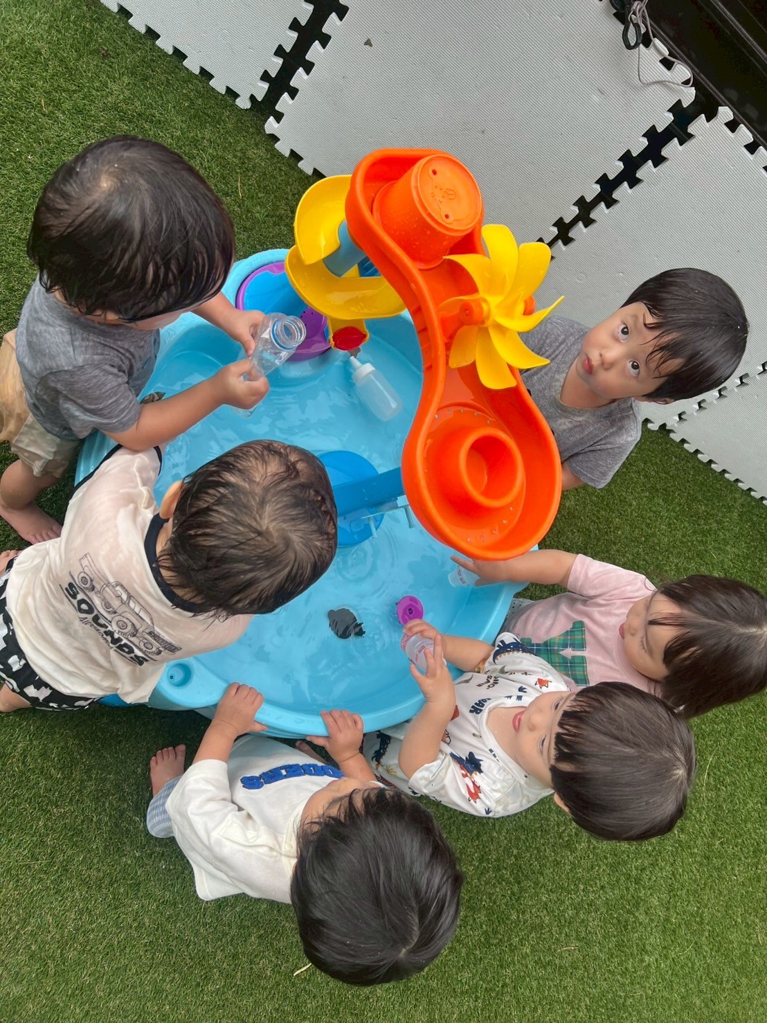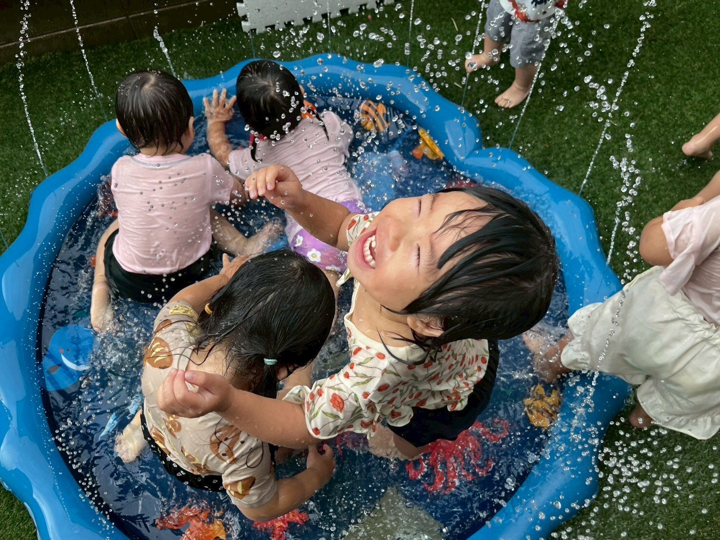お天気が心配だったのですが、小雨!止む!の繰り返しだったので大好きな水遊びをしました❣️今日は噴水タイプのプールもあり子どもたち大興奮💛
