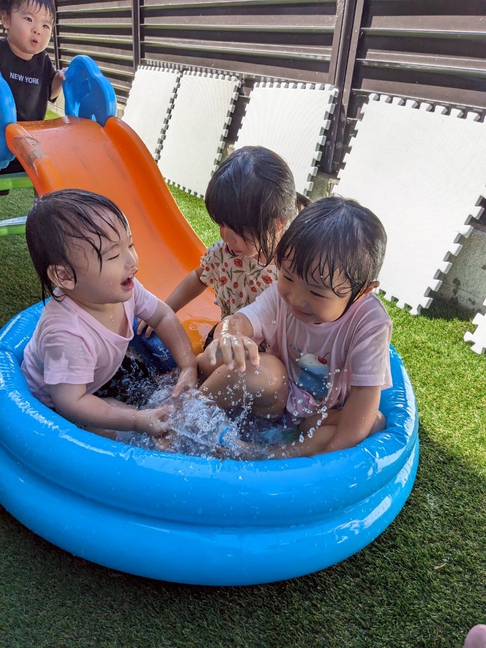 朝から「今日プール😆」と嬉しそうなお友だち😊水遊びの手遊びで気分を盛り上げて、お外へlet’s go💨✨🫶お水をお友だちとかけ合いっこしたり、すべり台からプールに入ったりとても楽しそうでしたよ😍✨