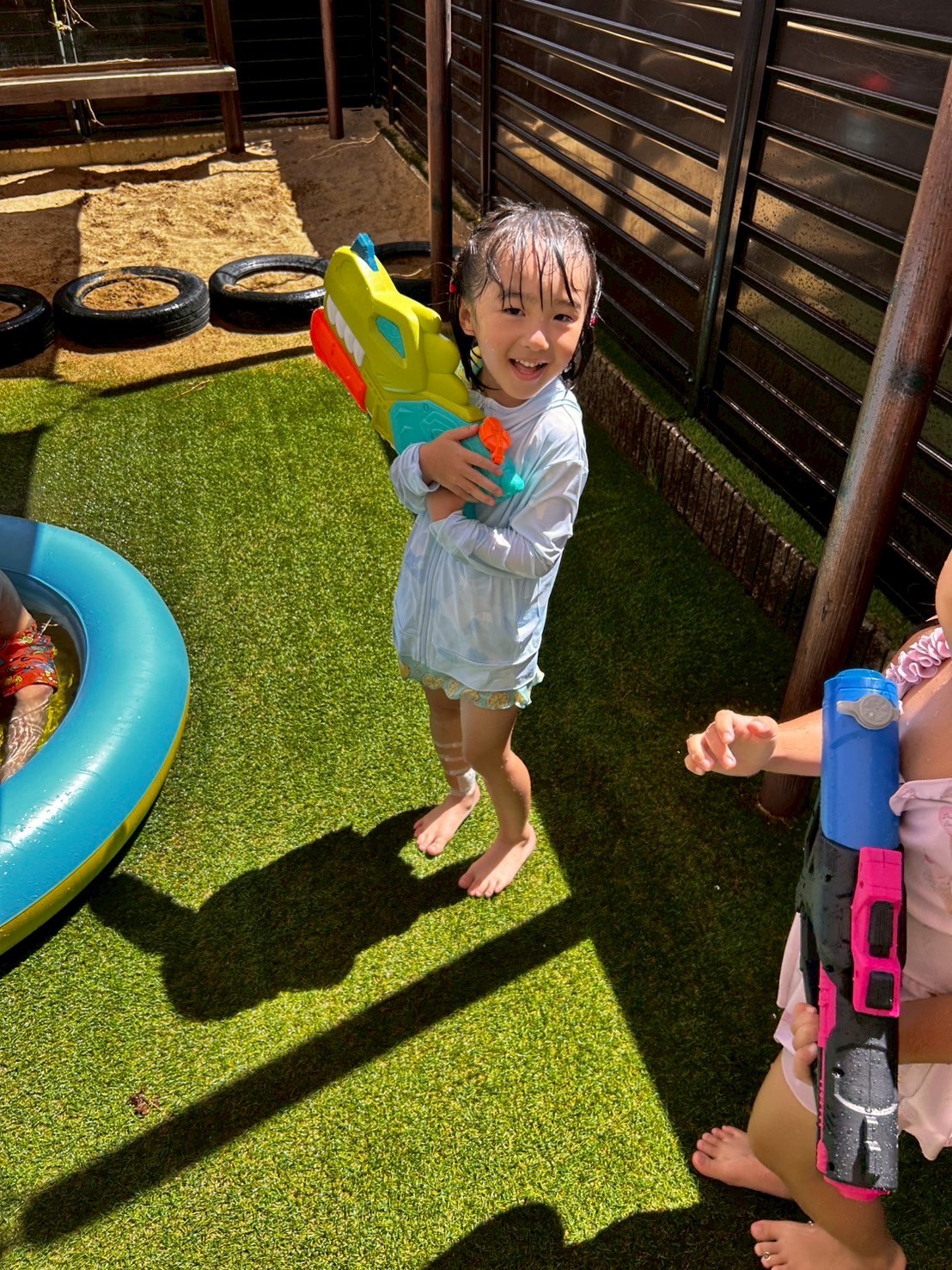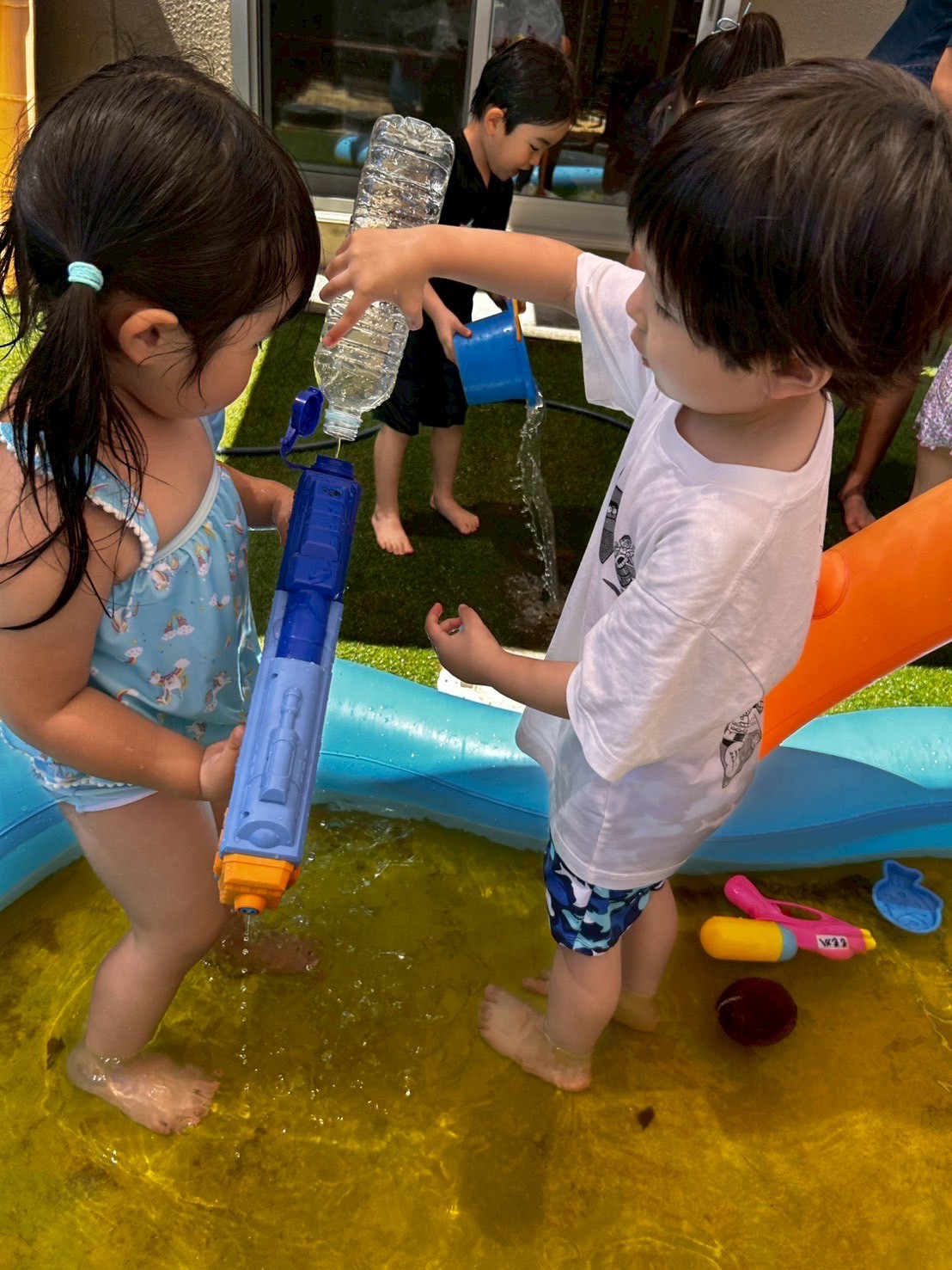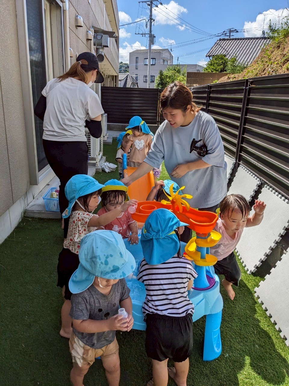 今日は水遊びの日🌊💕昨日から来てくれているインタビューシップのゆづきさん先生と一緒にできるということもあり、いつも以上に盛り上がっていましたよ🤗くじ引きで決めて2つのグループに分かれての水遊び、1つ目のグループは水鉄砲が大活躍で先生たちを狙い撃ち😎水の掛け合い合戦で賑わいました😆2つ目のグループさんは、バケツにためて水を頭からざぶ〜ん!!と被り水浴び合戦❣️どちらもすごく楽しそうでした🌟お部屋では好きなキャラクターの塗り絵をしました😌✨