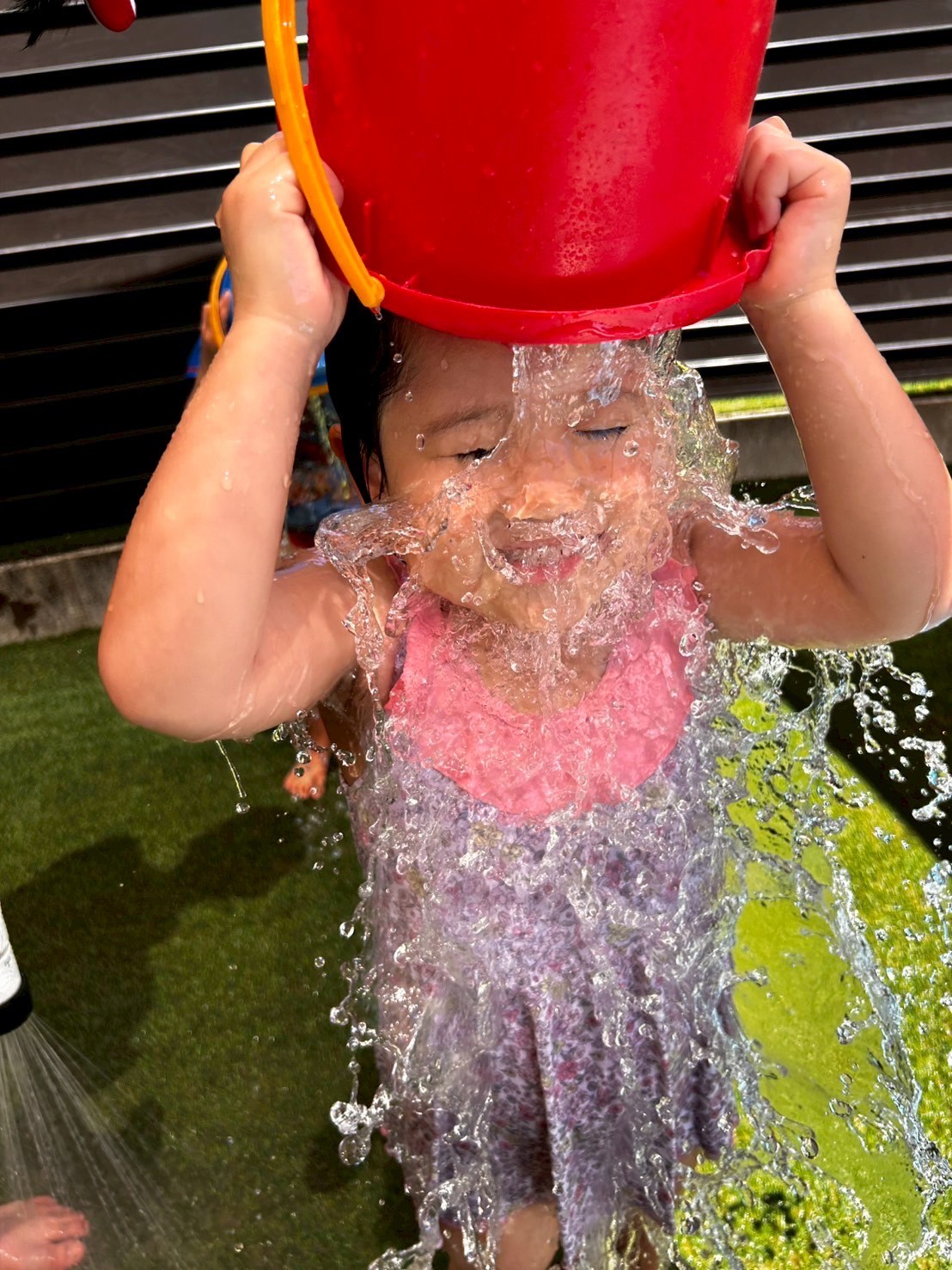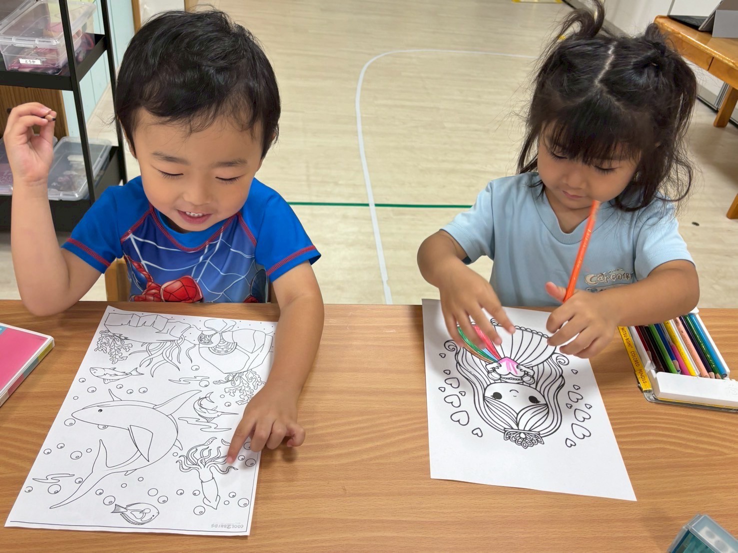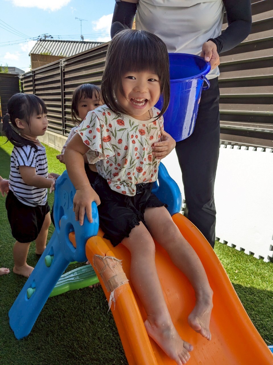 今日は水遊びの日🌊💕昨日から来てくれているインタビューシップのゆづきさん先生と一緒にできるということもあり、いつも以上に盛り上がっていましたよ🤗くじ引きで決めて2つのグループに分かれての水遊び、1つ目のグループは水鉄砲が大活躍で先生たちを狙い撃ち😎水の掛け合い合戦で賑わいました😆2つ目のグループさんは、バケツにためて水を頭からざぶ〜ん!!と被り水浴び合戦❣️どちらもすごく楽しそうでした🌟お部屋では好きなキャラクターの塗り絵をしました😌✨