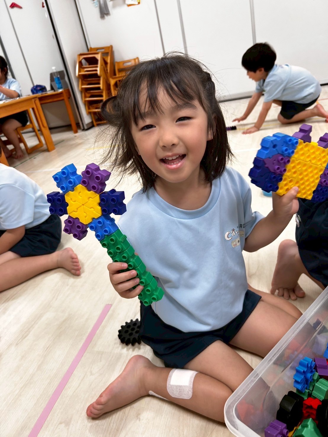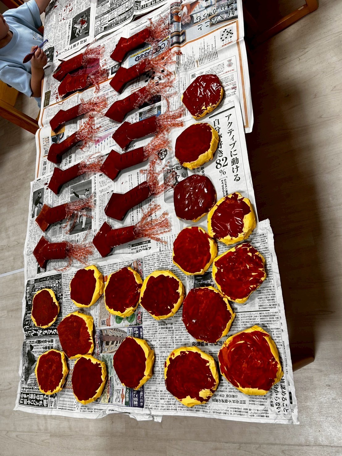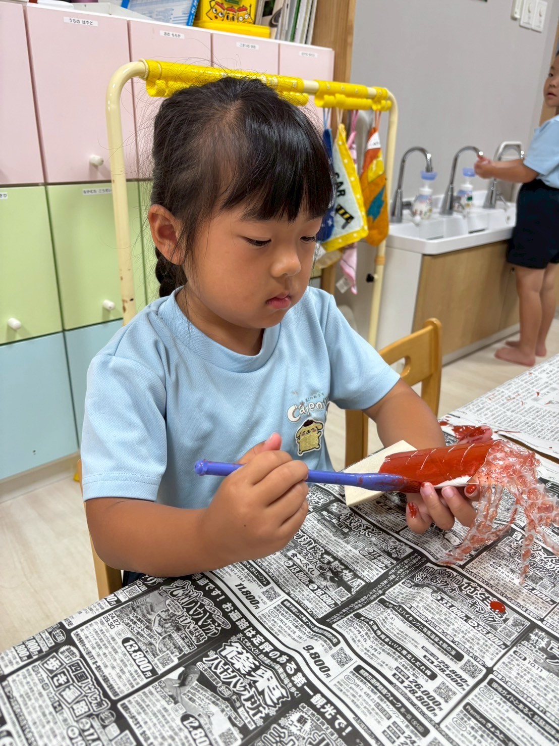 そして絵本の読み聞かせと身体測定の後は、夏祭り製作をしました❣️今日はイカ焼きとお好み焼き🌟みんなの丁寧な作業で、どちらもソースが染みて美味しそうに仕上がりました☺️✨まだまだ続きがあるので完成が楽しみです💖製作の順番を待っている間にはブロックで遊びました😆みんな日に日にクオリティが上がっていて、完成度に驚かされます🤩