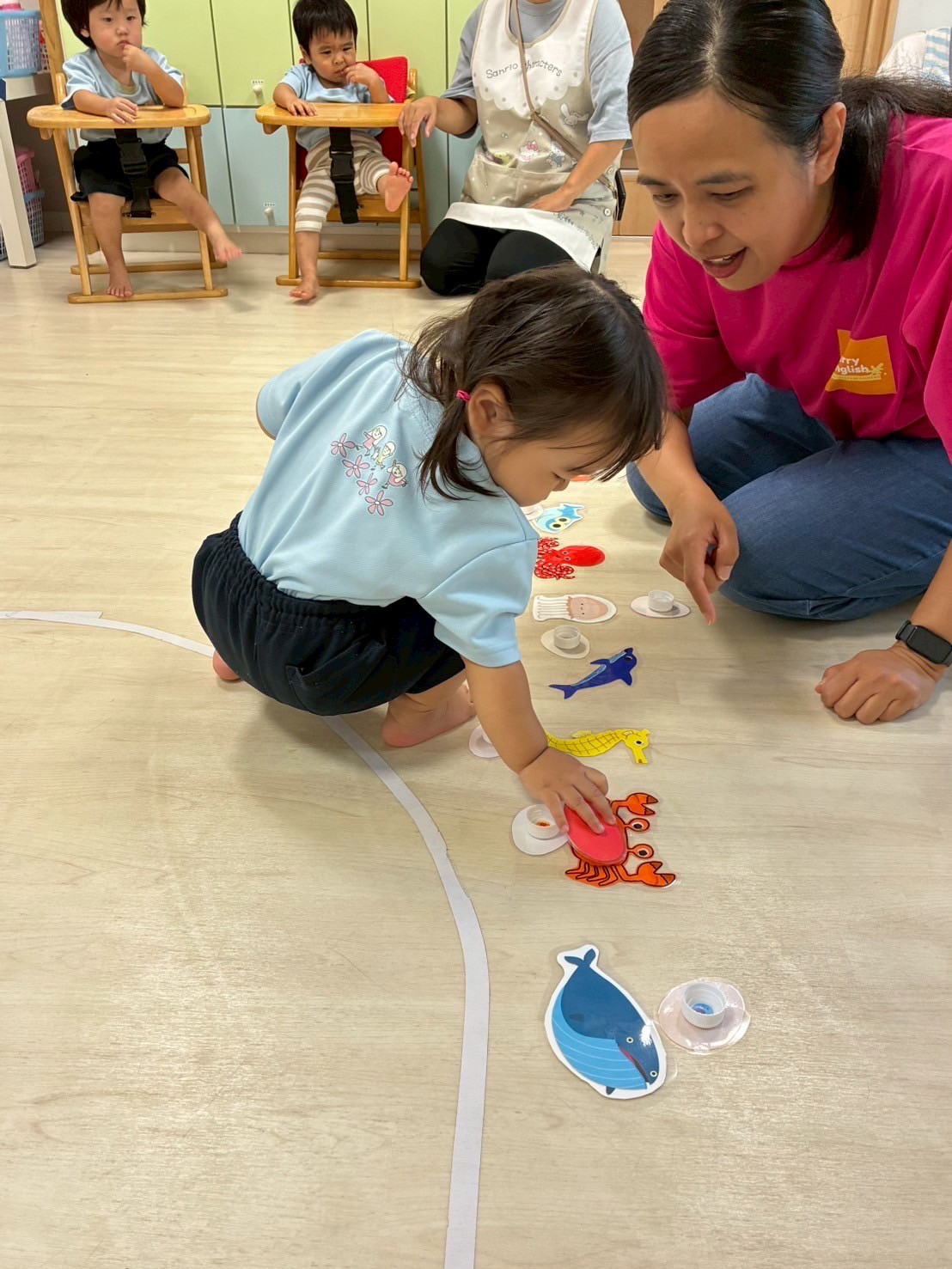 今日は英語レッスンの日🌟今日のテーマも海の生き物でたまごの裏に隠されたシールを見て、同じ生き物のところに置くというゲームの中で単語に触れましたよ😆