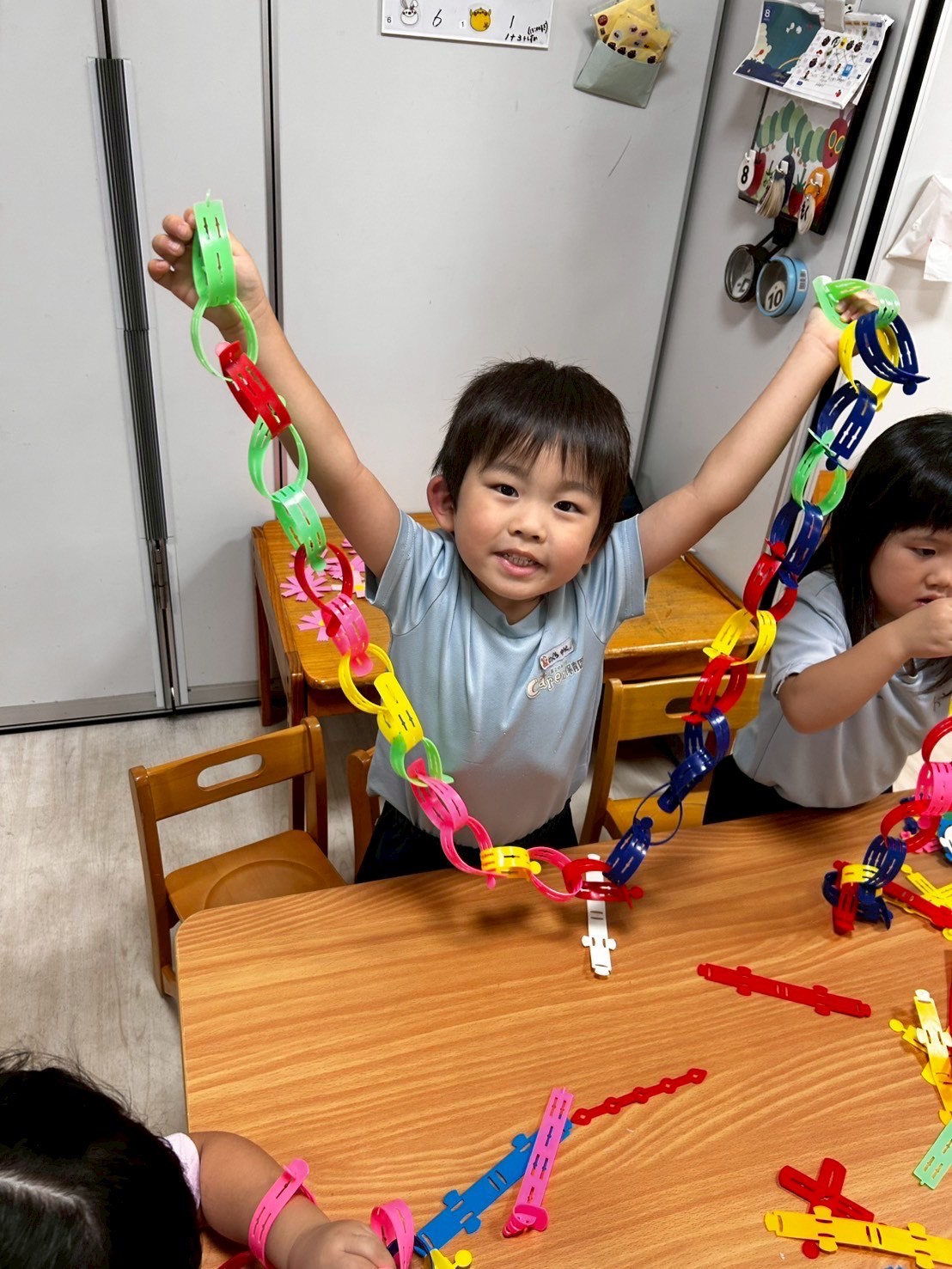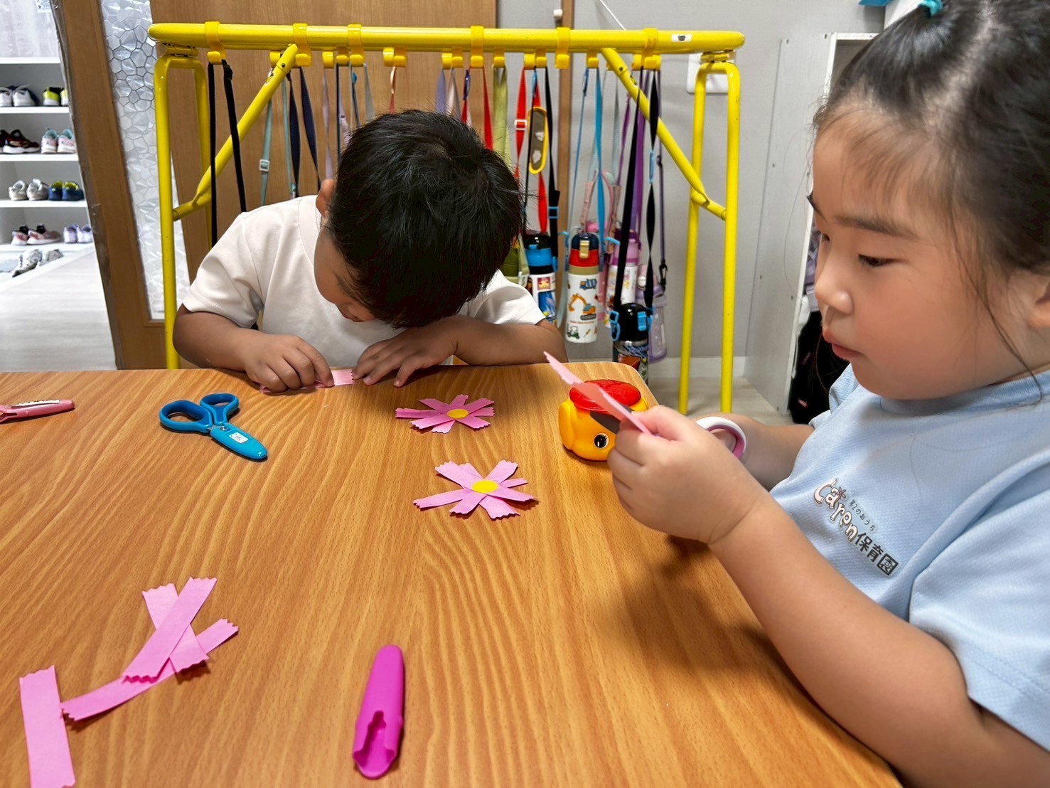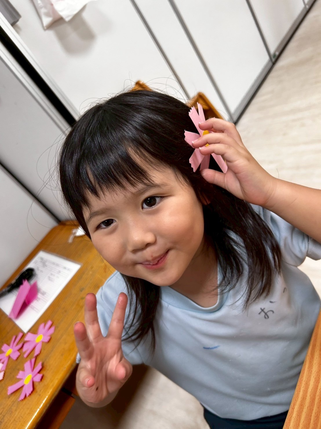 待ち時間には秋のお花のコスモスの製作をしたり、LaQやピップを使って想像力を働かせながら遊びました‼️プールやこま、王冠やハサミをなどいろんな作品が出来上がっていました☺️🎶😋