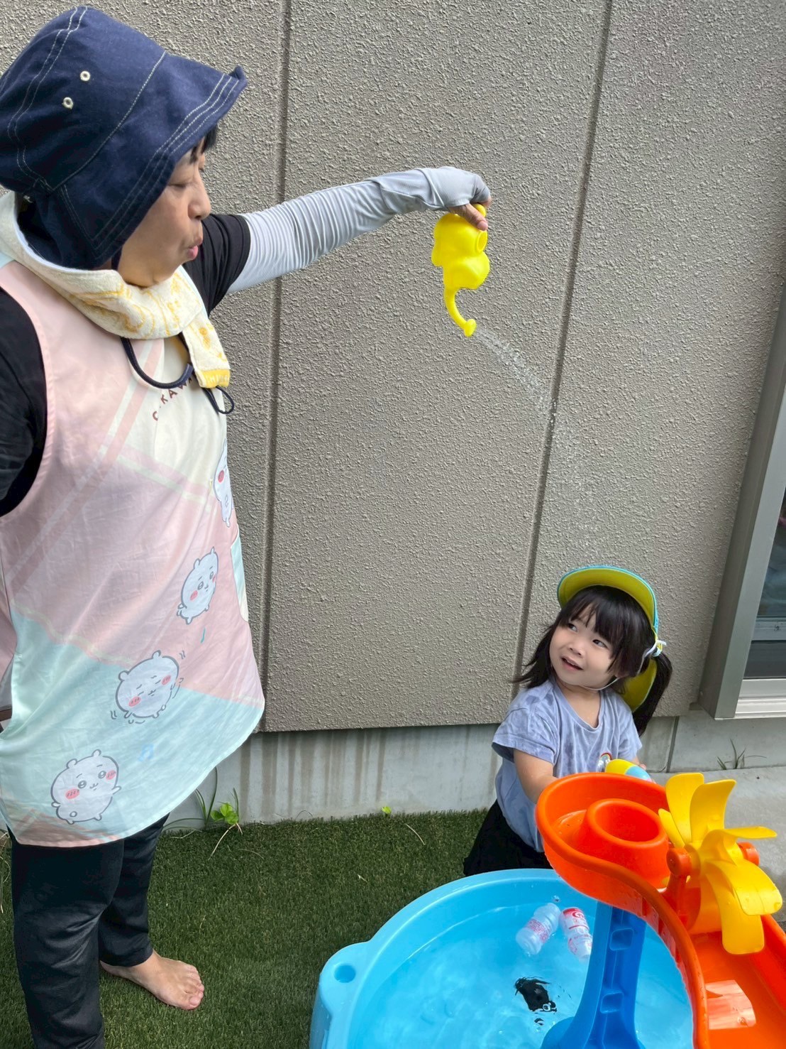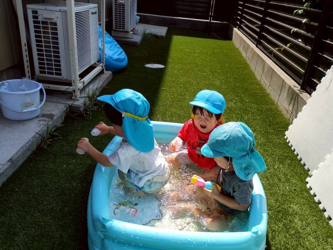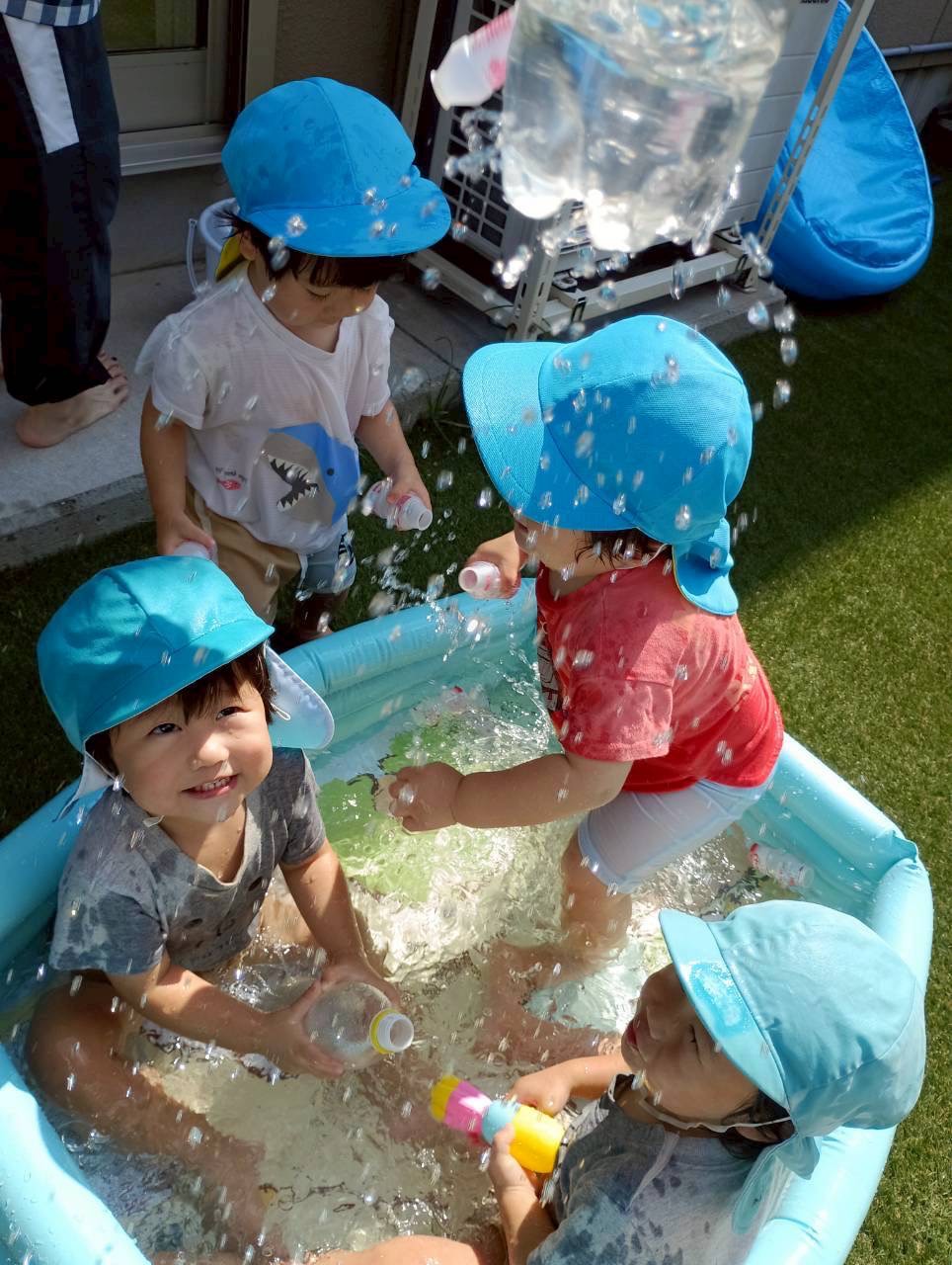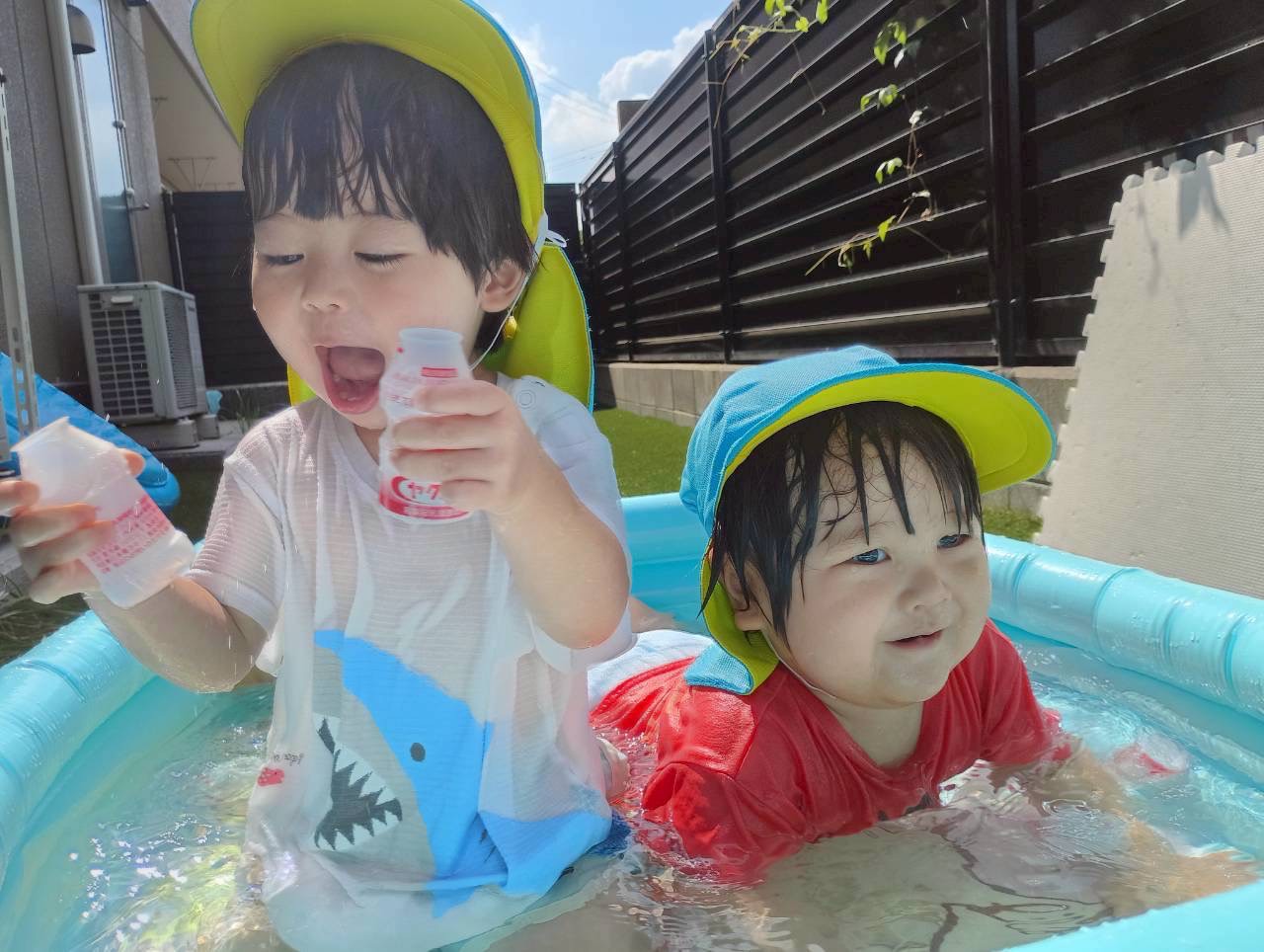 ヤクルトの容器に水を入れたり、プールで足をバタバタしたり遊びが少しずつ変わってきました😊