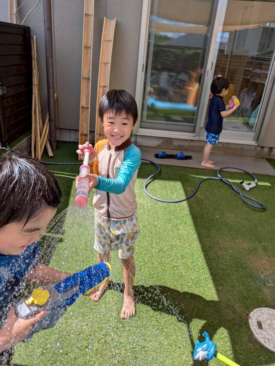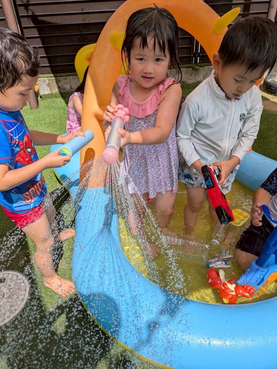 今日は雲ひとつないいいお天気☀️「最高〜❣️」と言いながら盛り上がっていました☺️もう準備にもすかり慣れて、あっという間に水着に👙💕上手になったのは着替えだけではなく、水鉄砲も命中率が確実に上がっています…😂避ける私たちも必死の水遊びですが、8月最終日にも関わらずまだまだ暑いので、今年は延長行いたいと思います‼️引き続き水遊びの用意をお願いします😃そして今日はお友だちとのお別れの日でもありました😢最終日で寂しくもありますが、最後の1日も水遊びをみんなで楽しむことができてよかったです💗新しい園でも元気で頑張ってほしいと思います🤗
