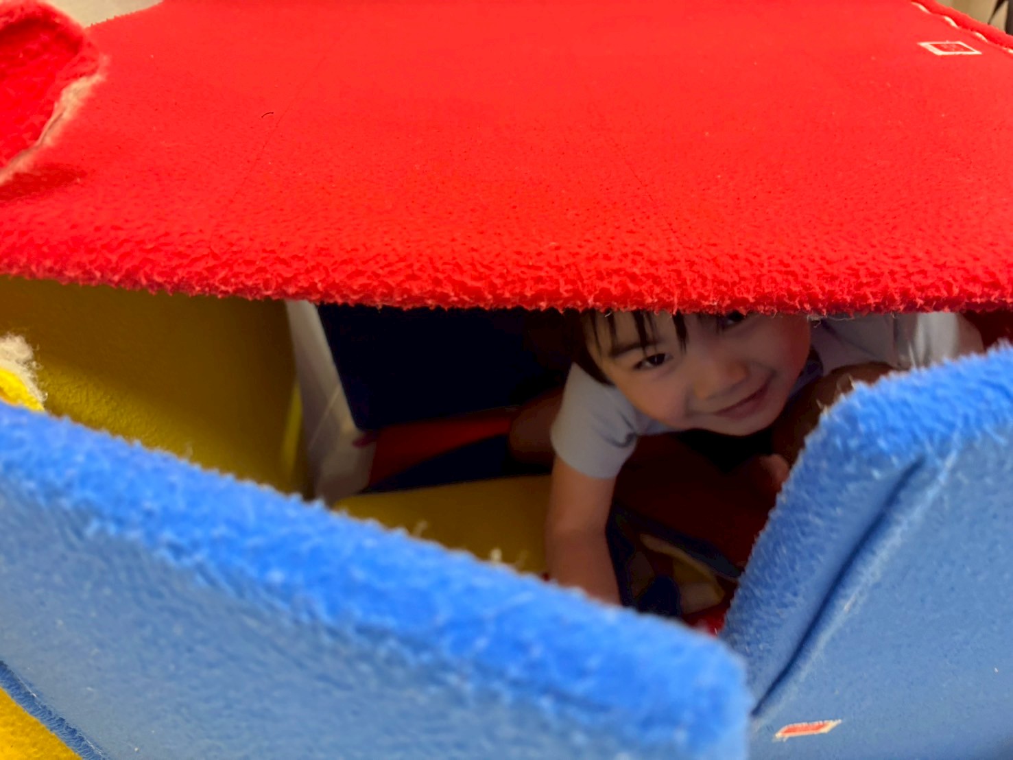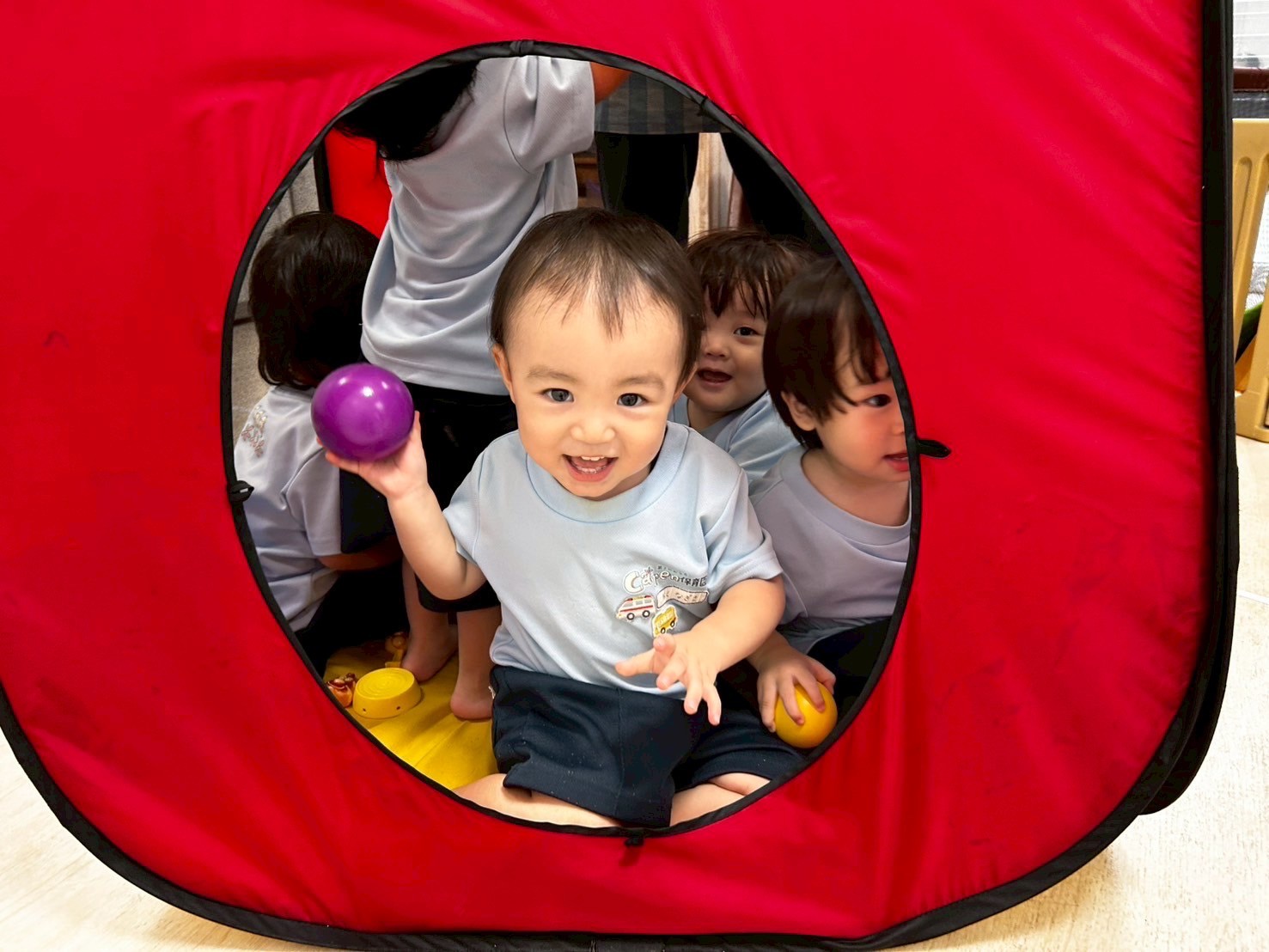 絵本の読み聞かせを楽しんだ後はアンパンマンのおもちゃやボールで遊びました⚽️「バイキンマン👿」「きいろ🟡」「あおー🟦」「これぼくのー」等言葉もたくさん出てきて、雨が降り出すと「みてーあめー💗」と大喜び。「あめ あめっ あめっ あめっ🌧️」と大合唱が始まり、みんなにこにこで楽しい雰囲気に包まれていました😊