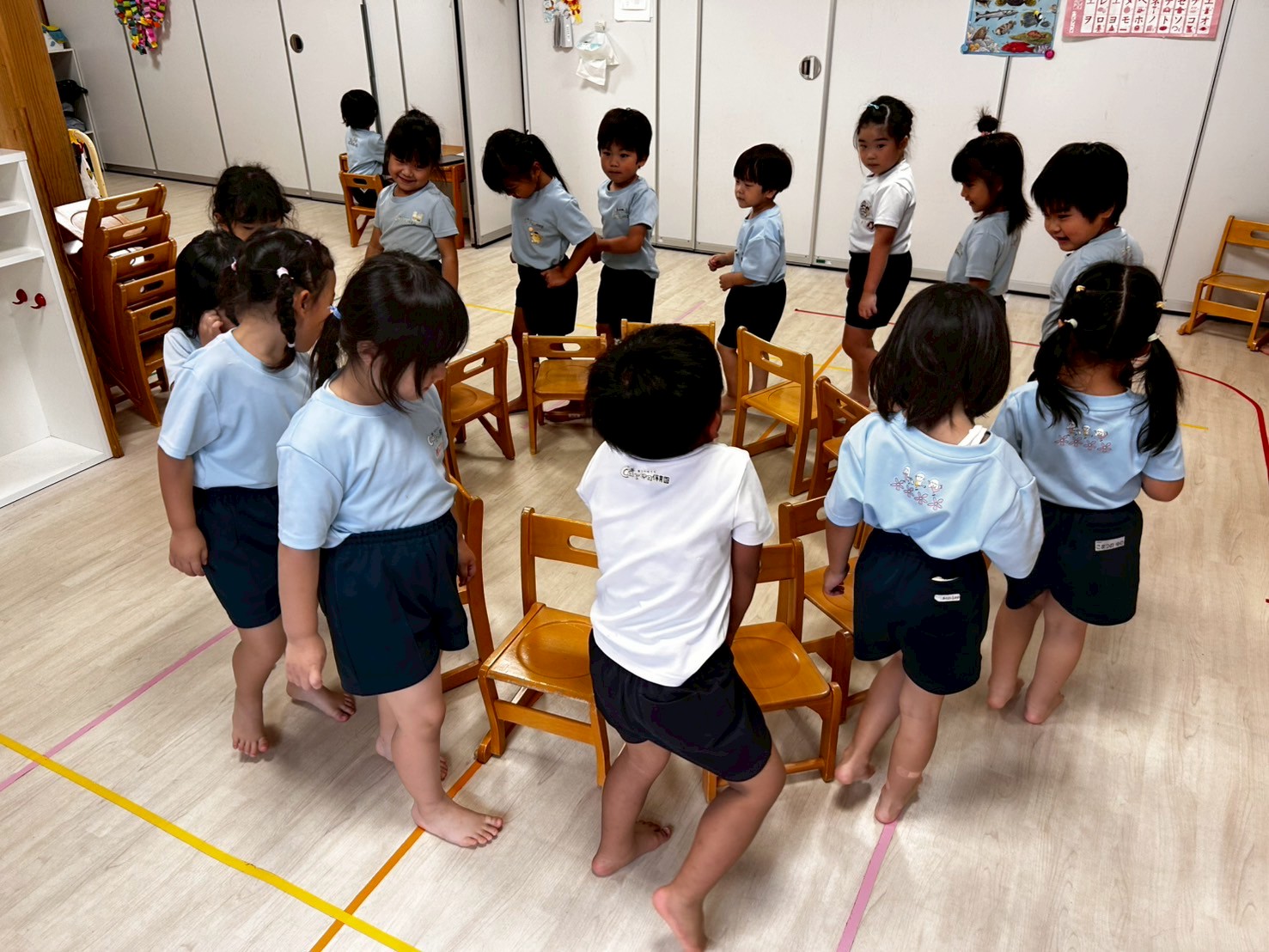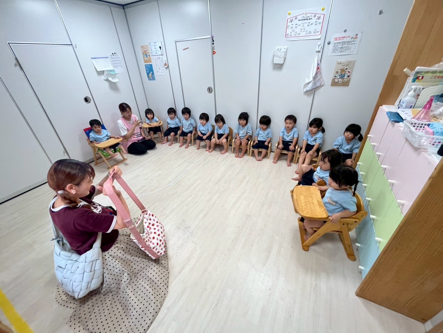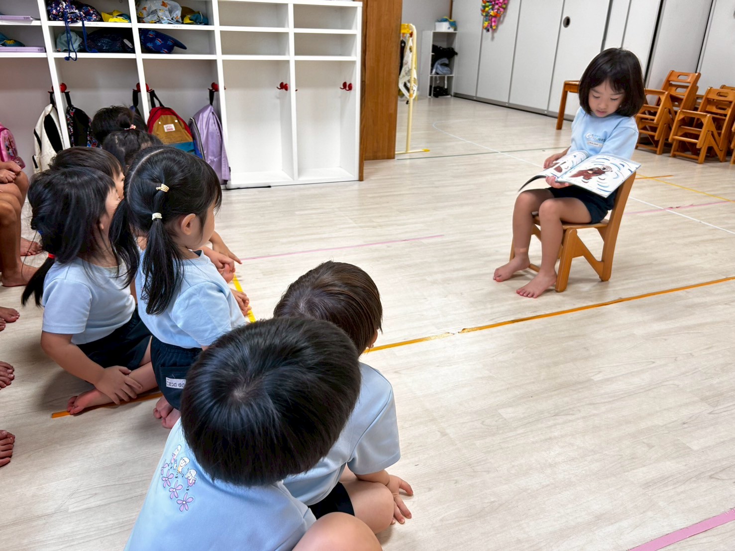 今日はきりんぐみさんに絵本の読み聞かせをしてもらいました‼️みんな読むのがどんどん上手になっています🤗その他にも小さい組さんのお着替えやおやつの手伝いなどのお世話も見つけては積極的にやってくれているんですよ💗読み聞かせの後はみんなで椅子取りゲーム😆ルールもしっかり定着しているので、声をかけあったり、応援したりしながら参加することができています✨やっぱり負けてしまうと悔しい気持ちはありますが、気持ちの切り替えもできるようになっています😌リトミックでは、風船を使ってウインナーを作ったり、ウサギになったり楽しいレッスン「まだしたい〜」とレッスンが終わることを嫌がる子もいましたよ😂🌟レッスンの待ち時間にはままごと遊びで、ごっこ遊びやお店屋さんなどそれぞれに楽しんでいました🤗💕