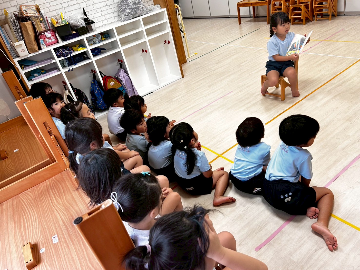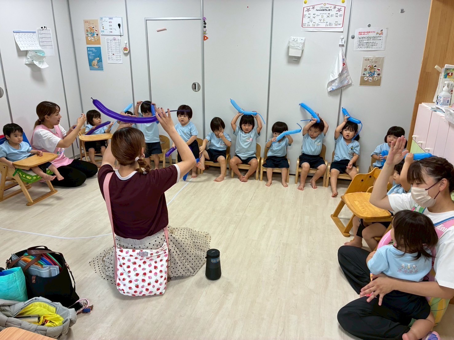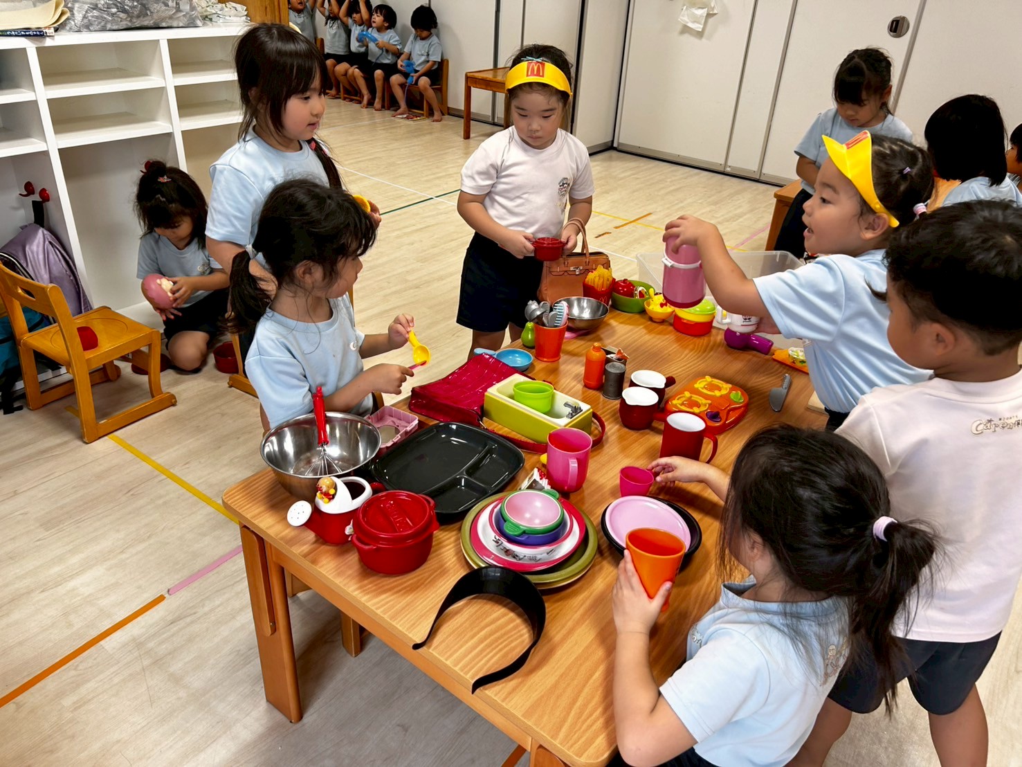 今日はきりんぐみさんに絵本の読み聞かせをしてもらいました‼️みんな読むのがどんどん上手になっています🤗その他にも小さい組さんのお着替えやおやつの手伝いなどのお世話も見つけては積極的にやってくれているんですよ💗読み聞かせの後はみんなで椅子取りゲーム😆ルールもしっかり定着しているので、声をかけあったり、応援したりしながら参加することができています✨やっぱり負けてしまうと悔しい気持ちはありますが、気持ちの切り替えもできるようになっています😌リトミックでは、風船を使ってウインナーを作ったり、ウサギになったり楽しいレッスン「まだしたい〜」とレッスンが終わることを嫌がる子もいましたよ😂🌟レッスンの待ち時間にはままごと遊びで、ごっこ遊びやお店屋さんなどそれぞれに楽しんでいました🤗💕