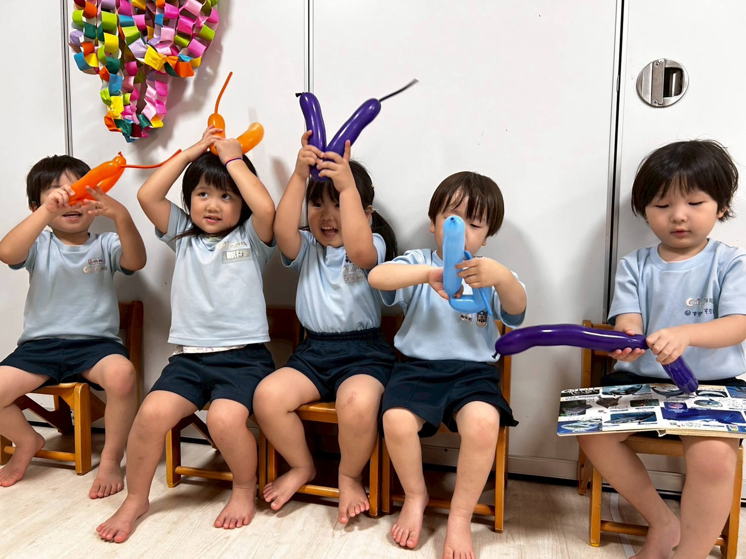 次は長い風船🎈風船を曲げたり、尻尾を伸ばしたり、いろいろな形に変身させましたよ💕最後はウインナーも作りました👏それぞれバルーンアートを楽しみました笑😊