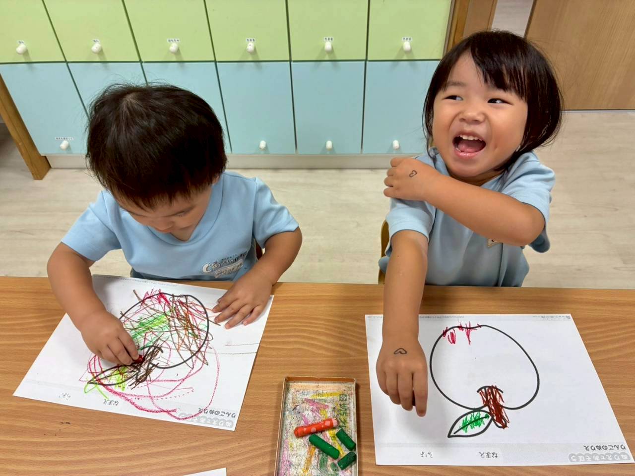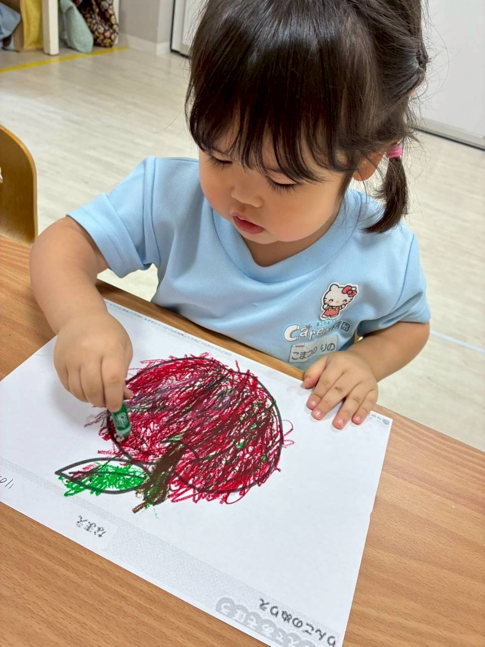 梨かな?色々想像を振り絞って赤や緑で小さく塗ることに気を付けながら塗っていきました🍎美味しそうな赤りんごや青リンゴが出来上がりました💓食欲の秋🍏次の色塗りを楽しみにしているぱんだ組さんです😊