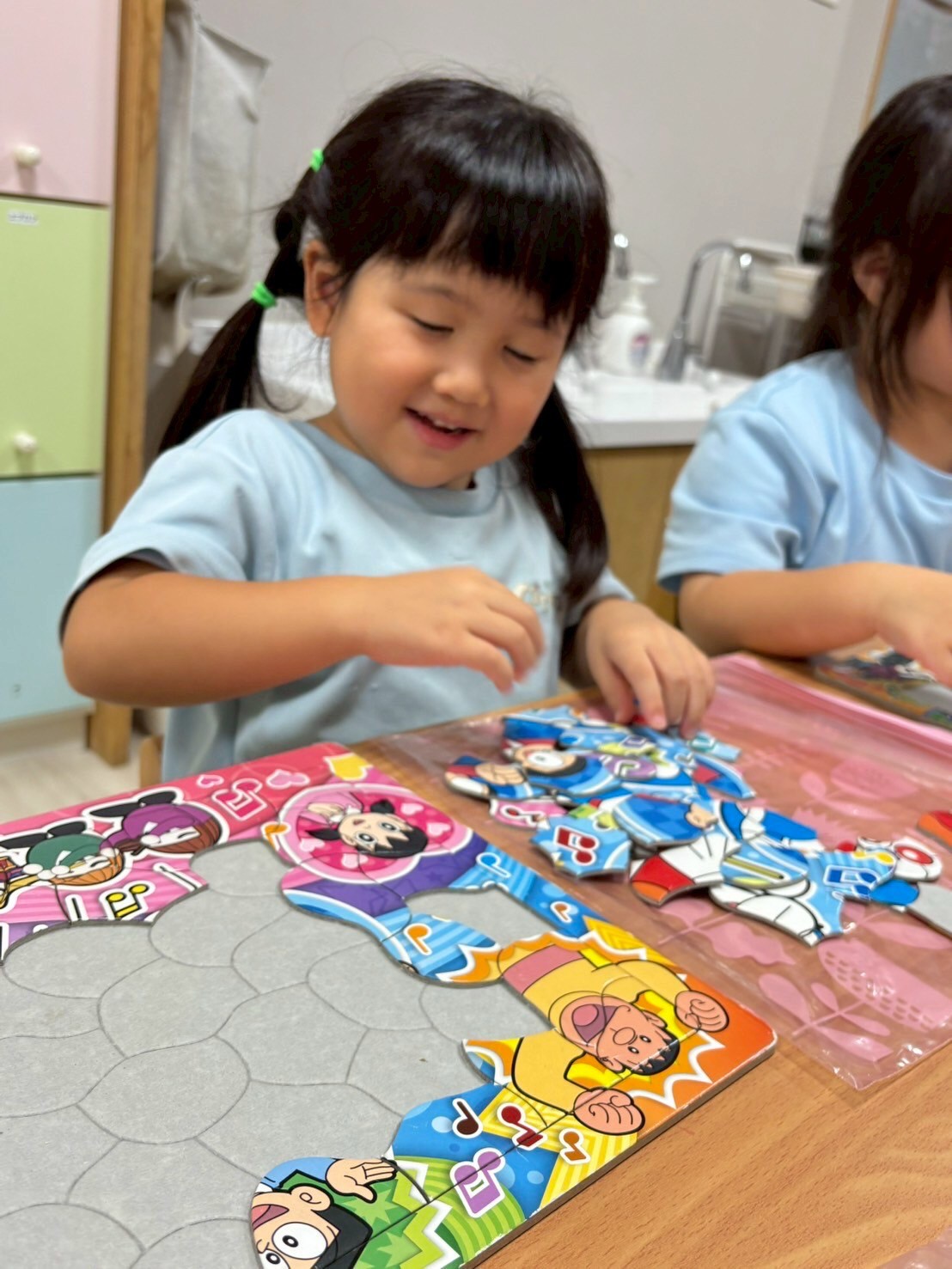 水遊びができず残念がっていた子も多かったですが、したい遊びを聴くと沢山の遊びが出てきましたよ❤️その中で、希望が多かった「爆弾ゲーム」「ぬり絵」「パズル」をしました✨L字型の保育室を有効的に使い、爆弾ゲームで白熱している片方で、ぬり絵とパズルに夢中になっていました😆