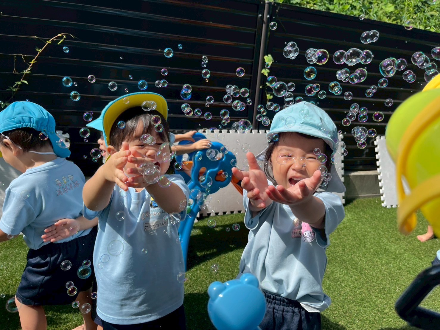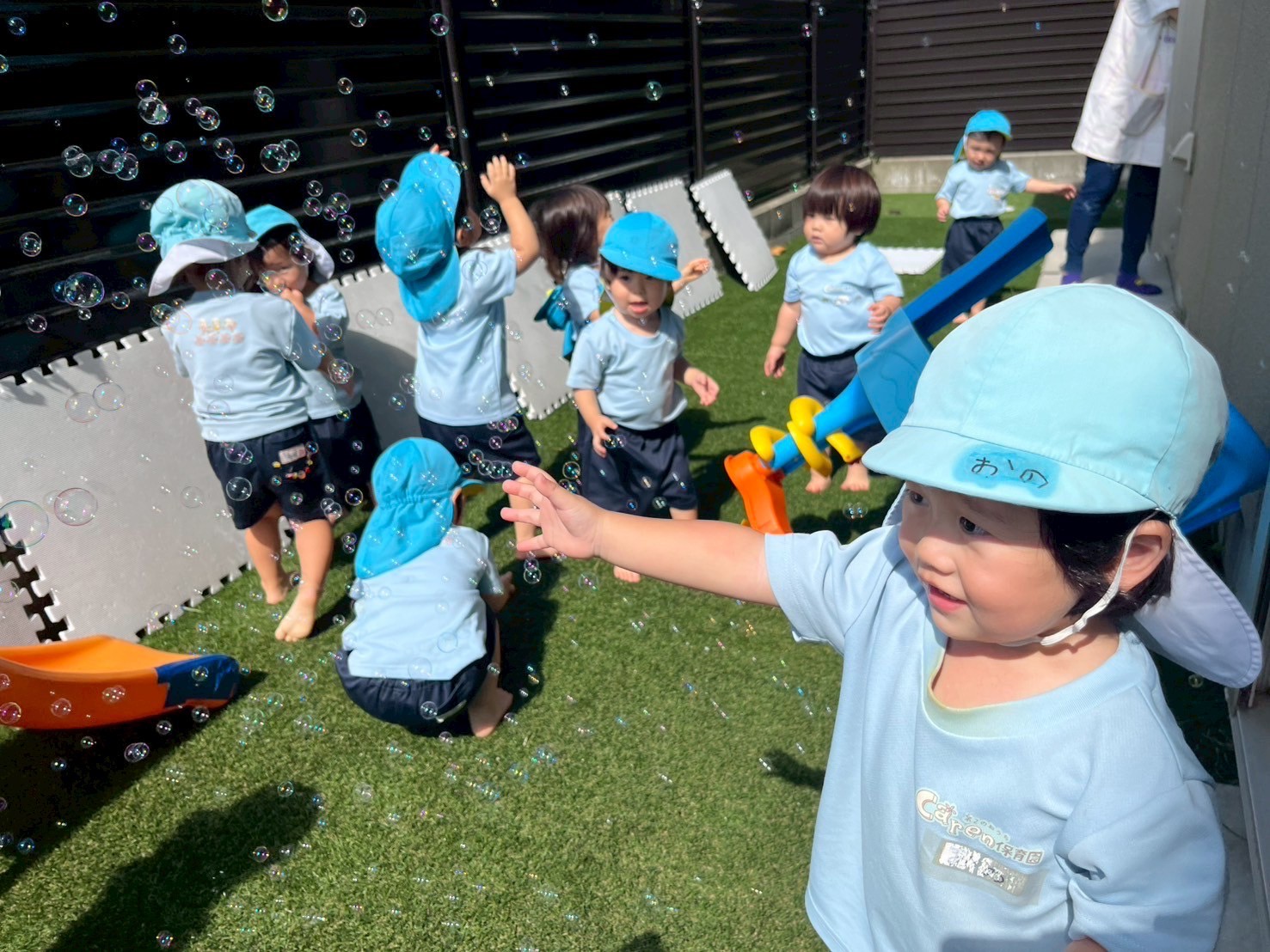 園庭では小さいぐみさんみんなでシャボン玉遊び🫧❣️シャボン玉に興味津々で追いかけたり触れたりして笑顔で楽しんでいました🌞