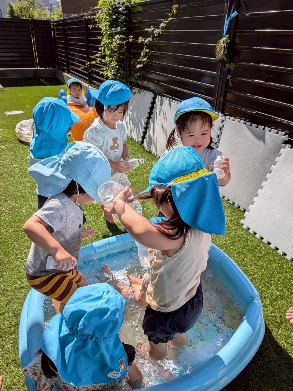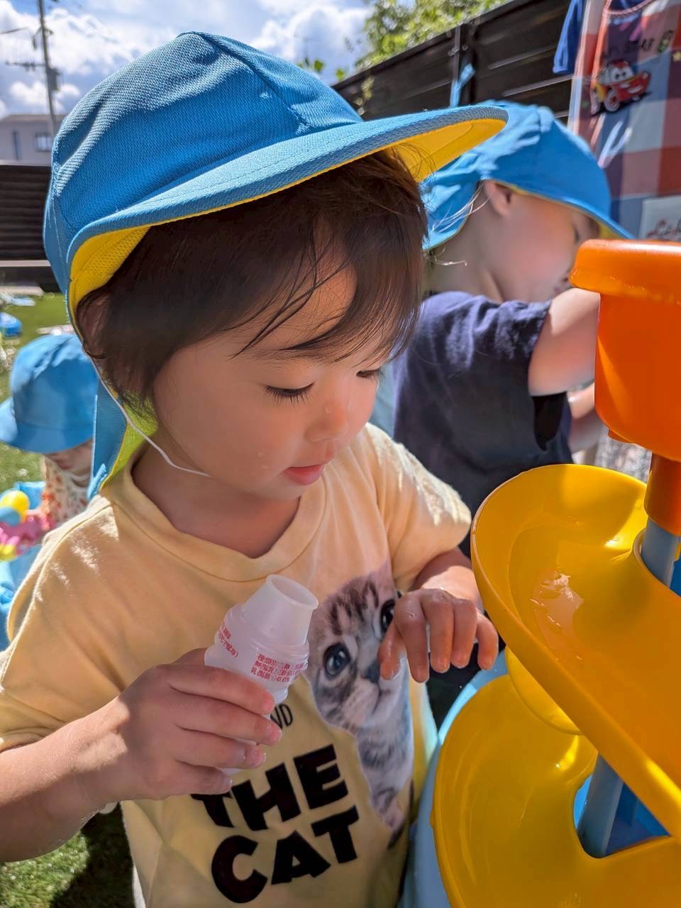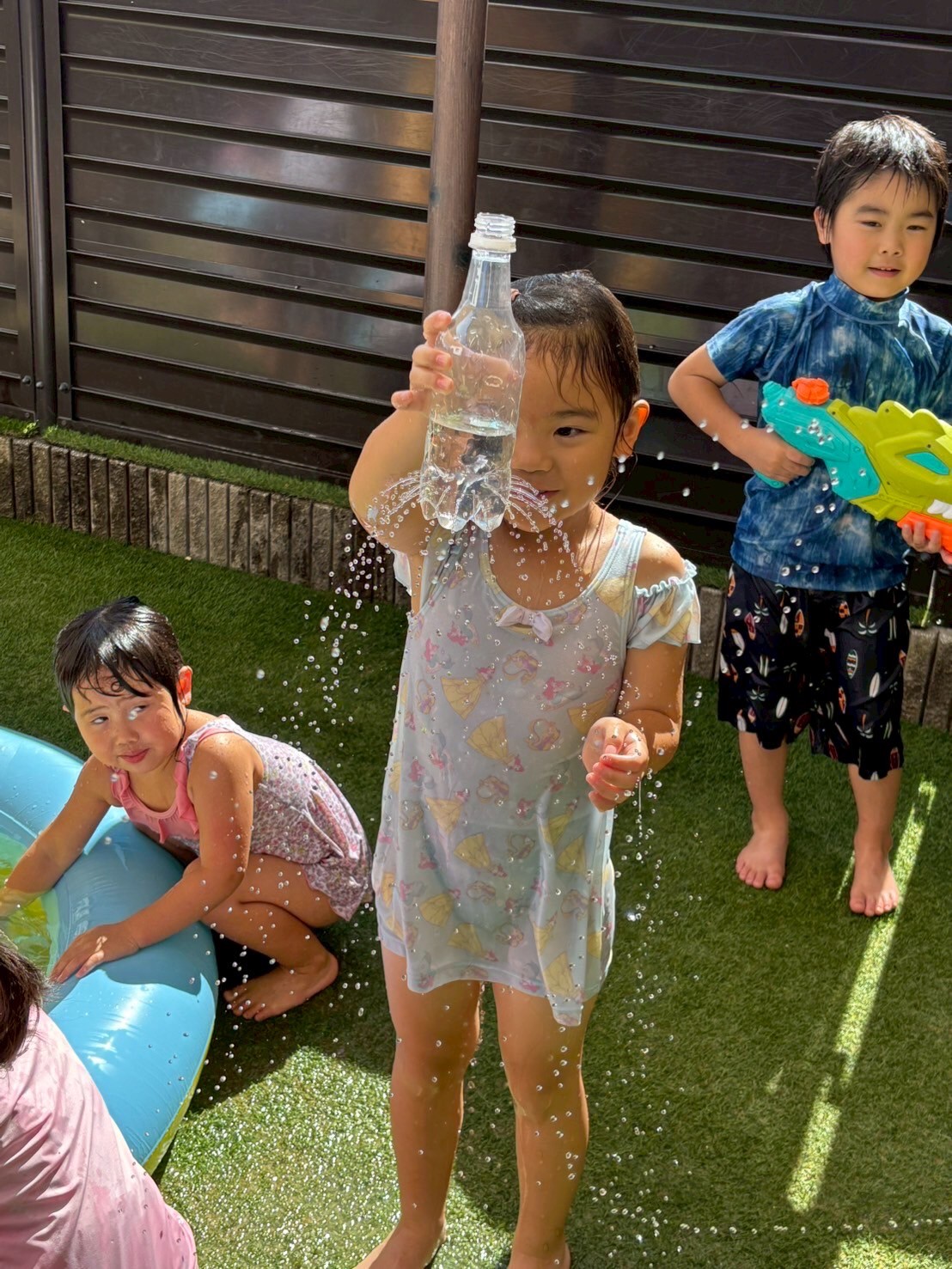 ペットボトルのシャワーを使ってお友達や先生にもお水をかけてくれたり😆