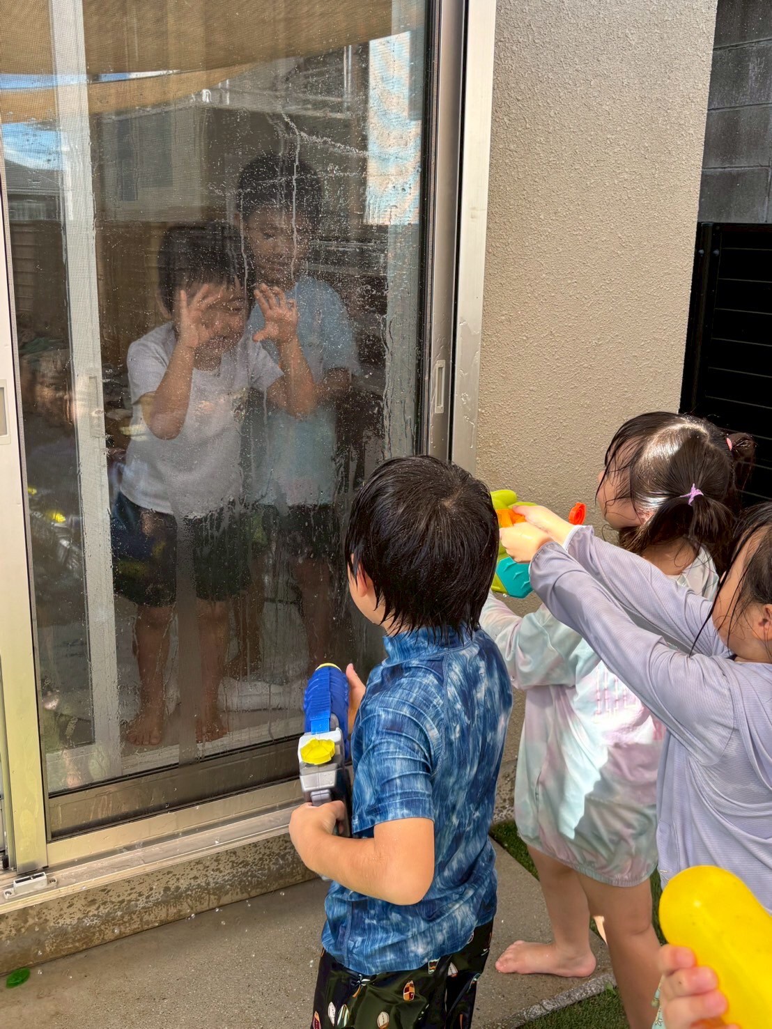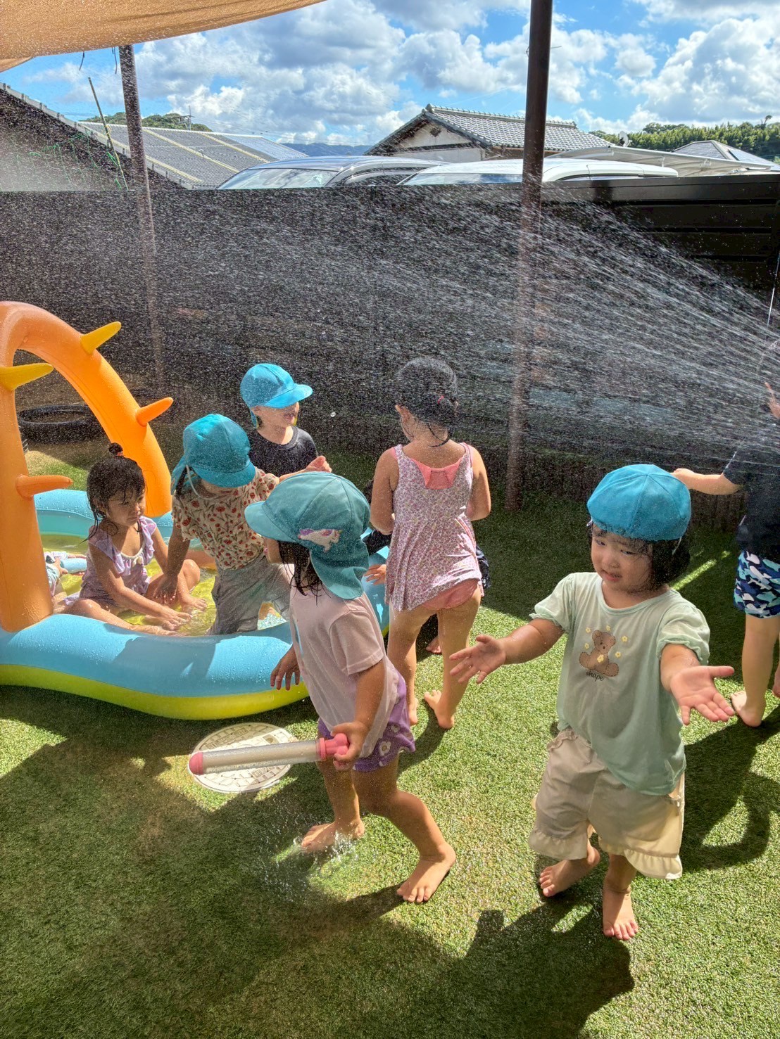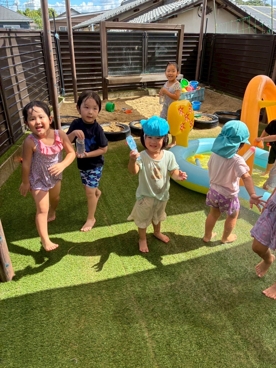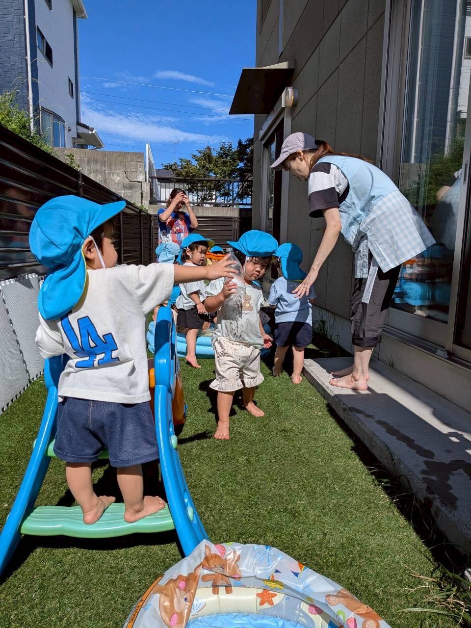 ペットボトルのシャワーを使ってお友達や先生にもお水をかけてくれたり😆