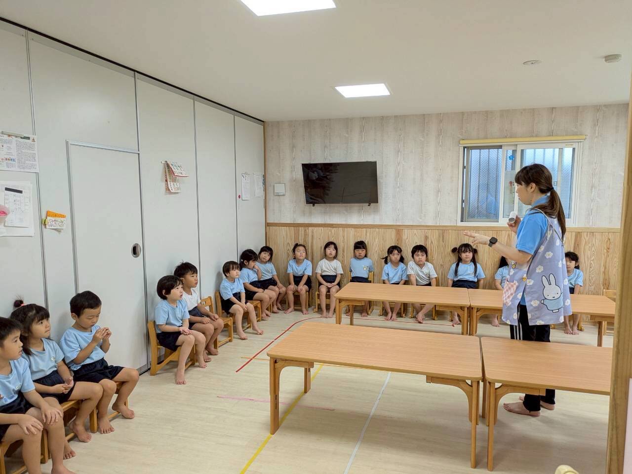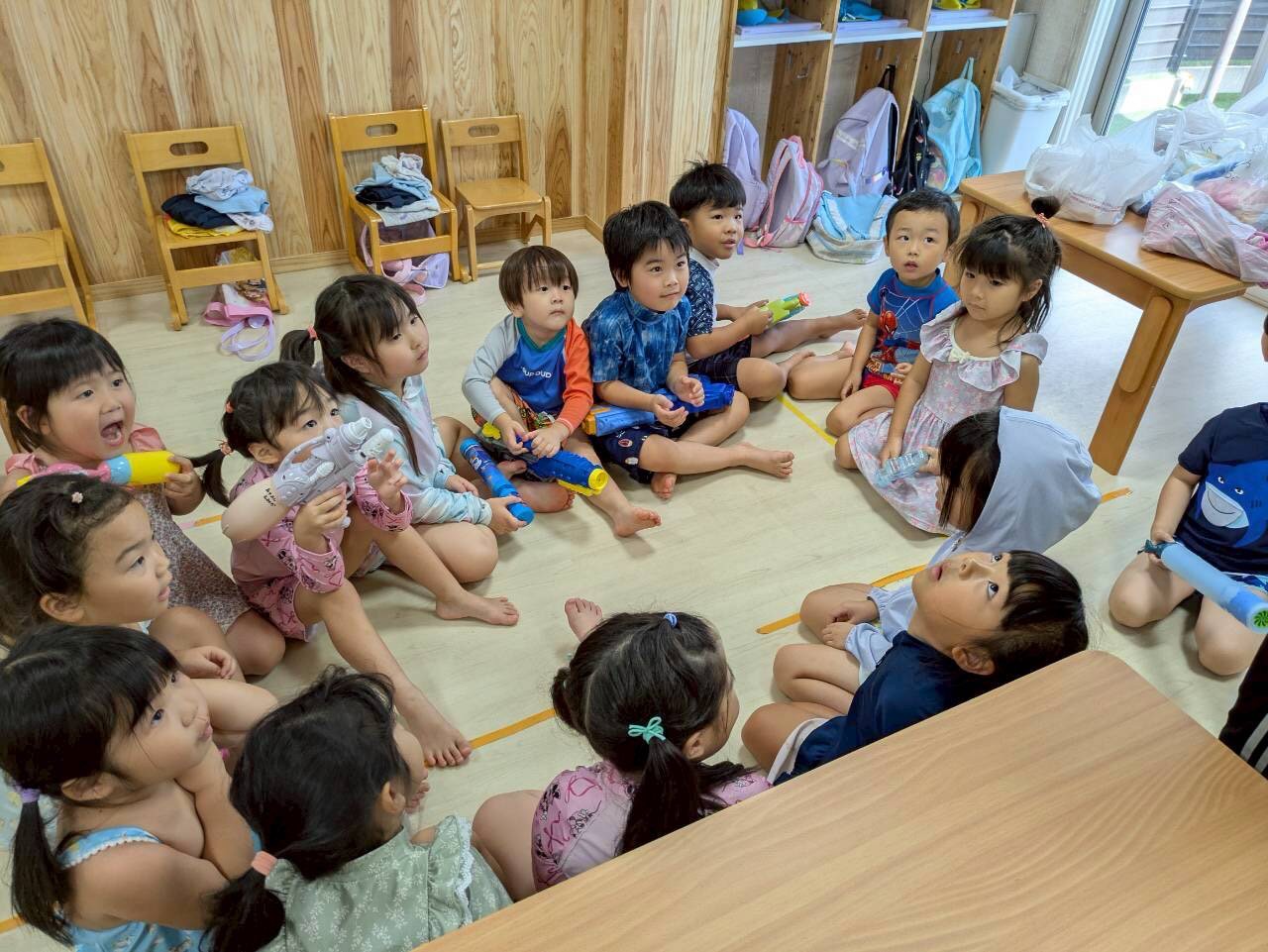 今日は水遊びの日✨お外に出る前に体操をしてしっかりと身体を動かしお外へ❣️