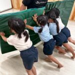 鉄棒にぶら下がり「さあ!!10秒!」の講師の先生にカウントされながらしっかりとしがみついていました😁マットの押し合いではみんなで力を合わせ『とりゃ〜!』と講師を倒していました🤣