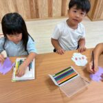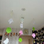 鉛筆の上をちぎるのが難しく「失敗したー🥹」「お化けやん大丈夫よ⭐️👌」などみんなで言いながら楽しみました💜ゆっくり、小さくちぎることに気をつけながら頑張りました✨おばけを作りながら「夜になったら動きだすけん〜」「見てみてー!」と自信満々に紹介してくれました🧡玄関に早速飾りました〜👻玄関に行く度に嬉しそうな子どもたちです😊