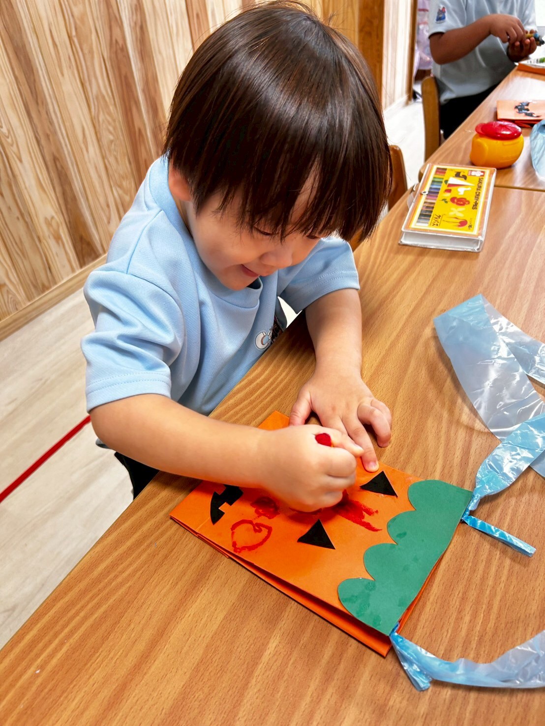 レッスンの待ち時間にはブロックで遊んだり、レッスンが終わった後にはハロウィンに向けての製作もしましたよ🎃事前にパンプキンがいいかフランケンシュタインがいいか決めていたのでその製作を進めました🤗まずはパーツを並べてそれから糊づけ…クレヨンを使ってアレンジも加えました😆かわいいお菓子入れができあがり、ハロウィンに向けての準備もバッチリです🥰【新宮園の今日の給食です】