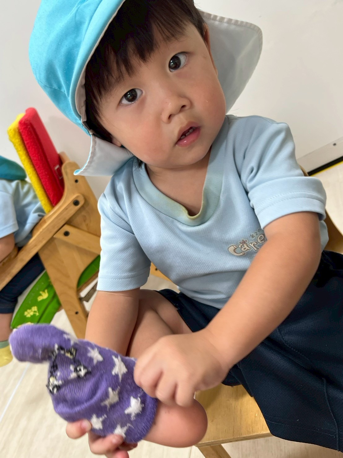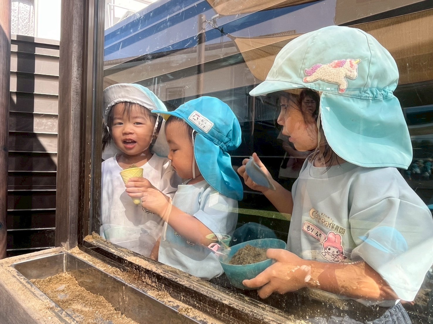 その後は園庭で思いっきり遊びました😊湿った砂をスコップですくっていつもとは違う感触を感じて嬉しそうでした🎵水分補給も気をつけながら過ごしています🌞✨