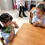 今日は食育の日でした🌟リボーンベジタブルと言って普段捨ててしまう小松菜の根っこを水とペットボトル、アルミホイルを使って再生させる方法について学びました🤗実際にグループごとにやってみたので今後のお世話を通して観察をしていきたいと思います💖その他の時間はうさぎ組さん、こあらぐみさんはお部屋マグペッタン・恐竜で協力し合いながら遊び、園庭では心地よい風を感じながら砂遊びや滑り台を楽しみました💗きりんぐみさんは発表会の練習で合奏の楽譜を読んだり、劇の動きやセリフを考えながら最後まで進めてみましたよ❣️