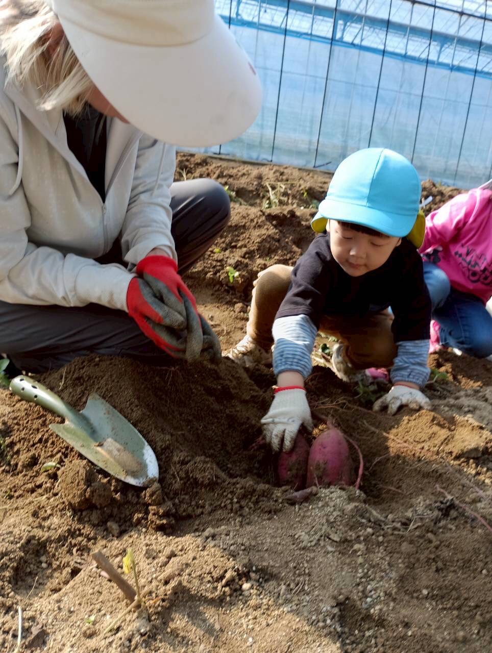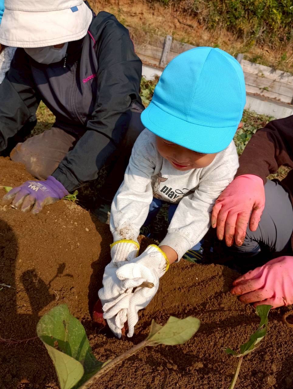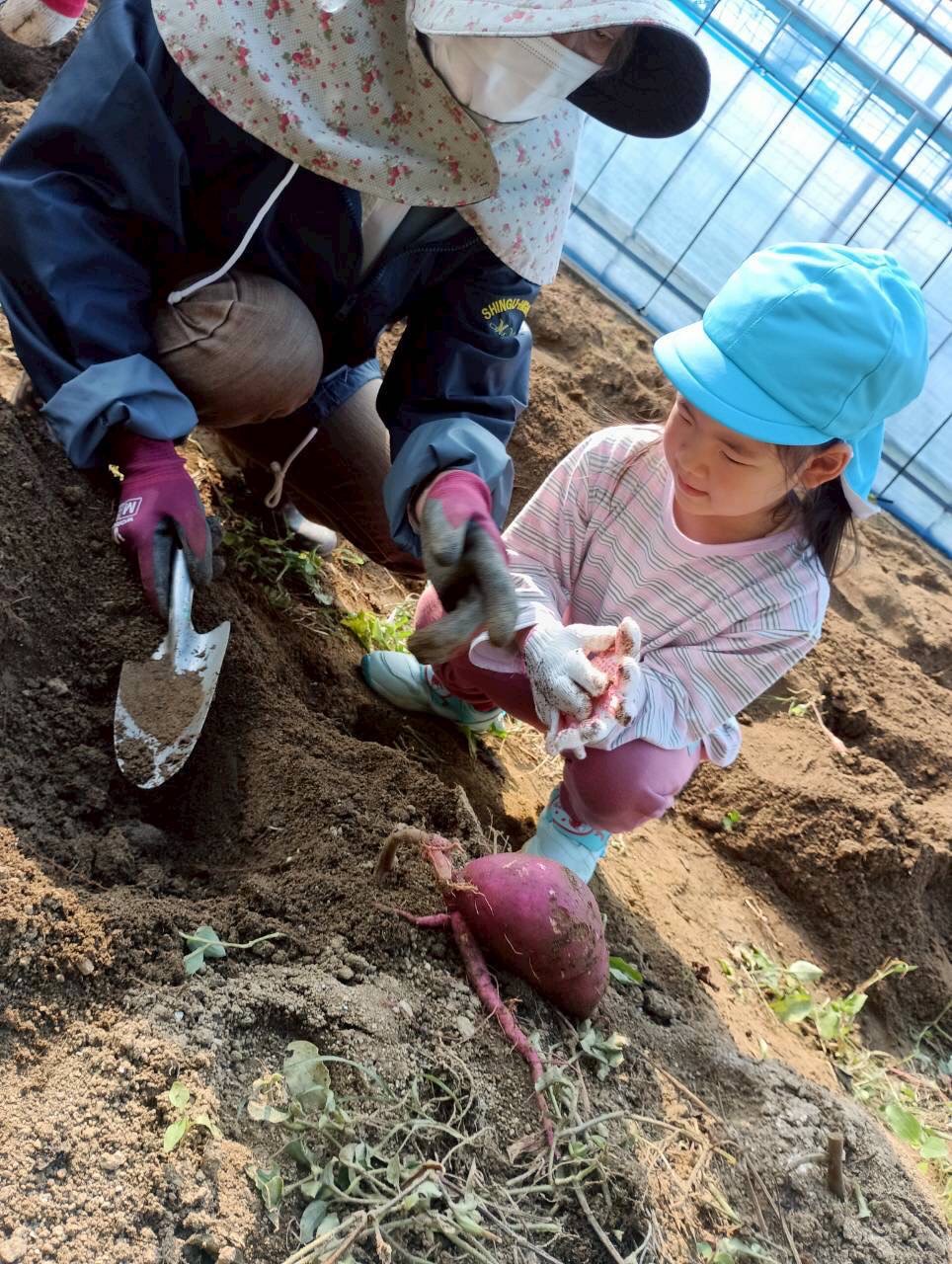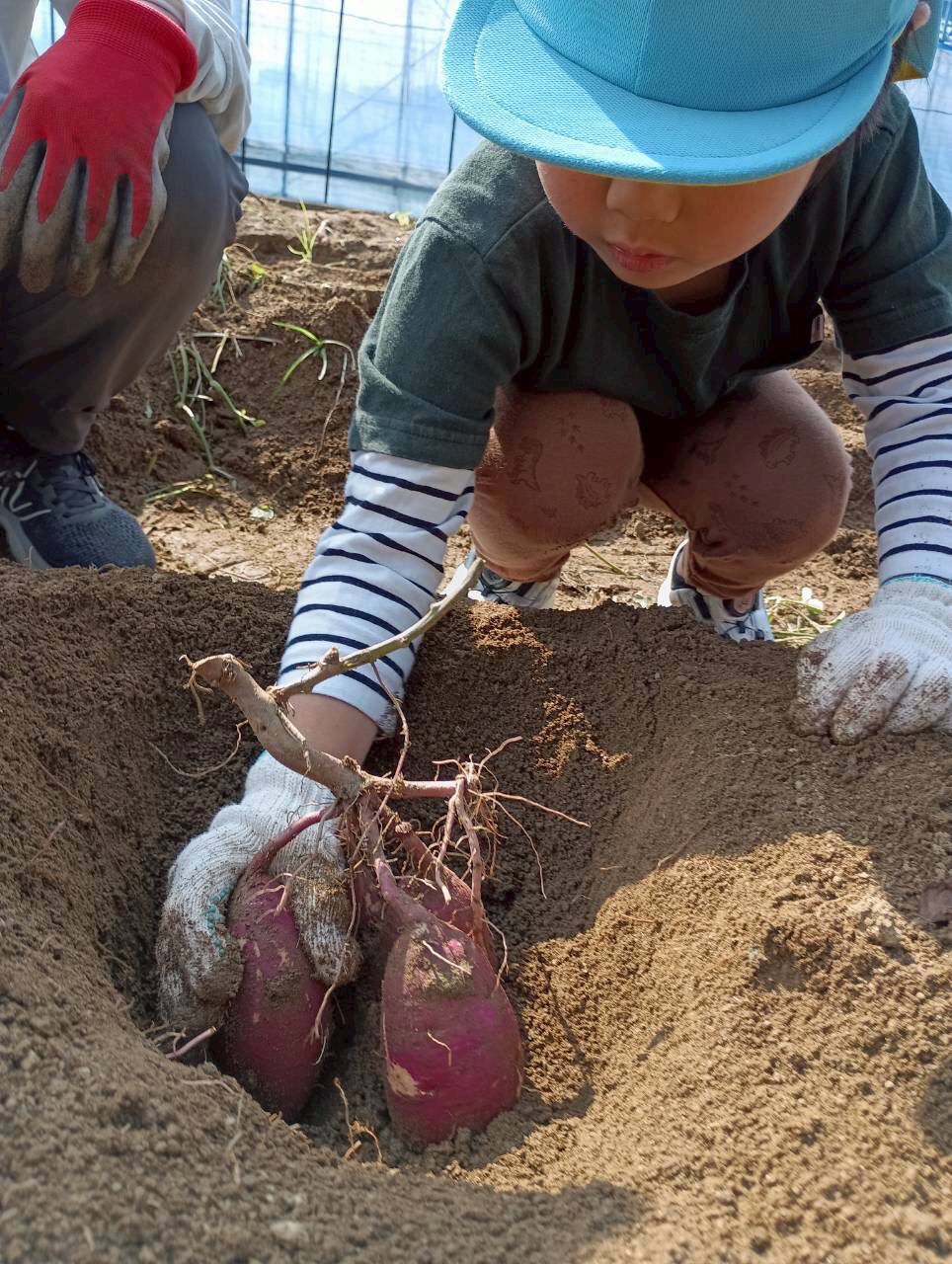 おばさんたちに『上手上手✨、ここここ!』と一緒なった🍠掘りをしてくれました!大きい🍠や小さな🍠を見つけては「先生見てみて!」と嬉しそうでした😄