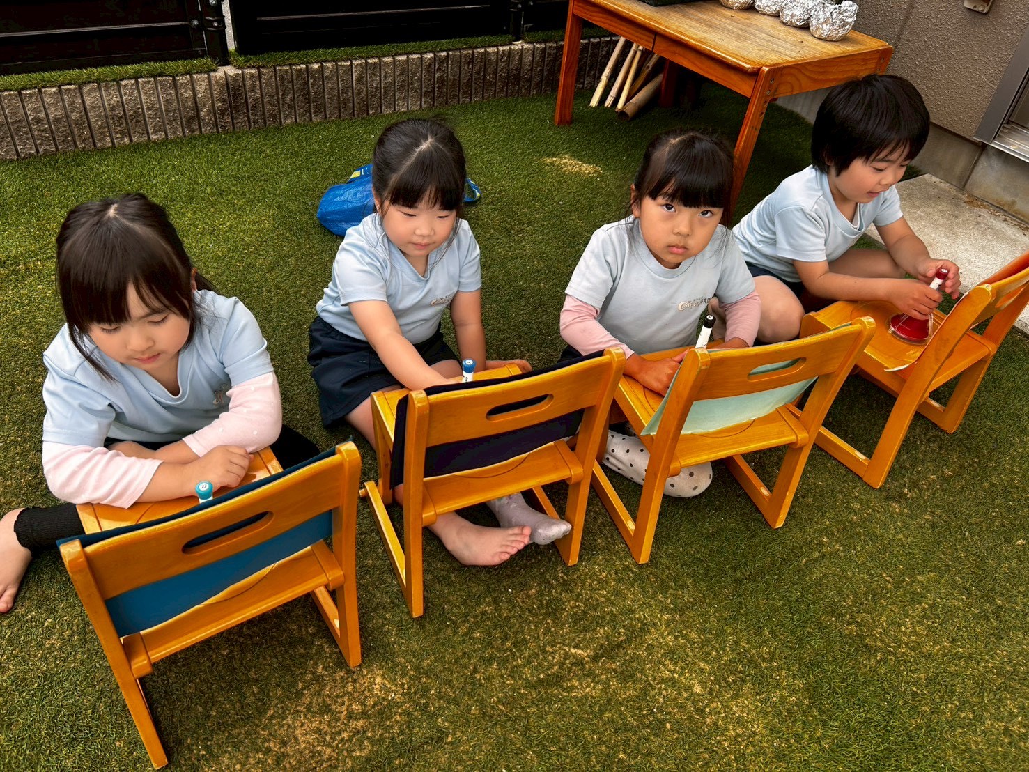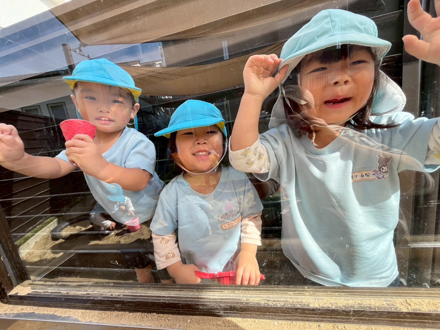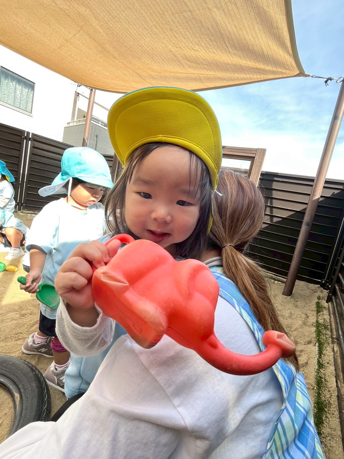 頑張った後の戸外遊びを心待ちにしていて、気持ちのいい気候の中、園庭で繰り返し滑り台を滑ったり砂をかけたりして楽しんでいましたよ🥰