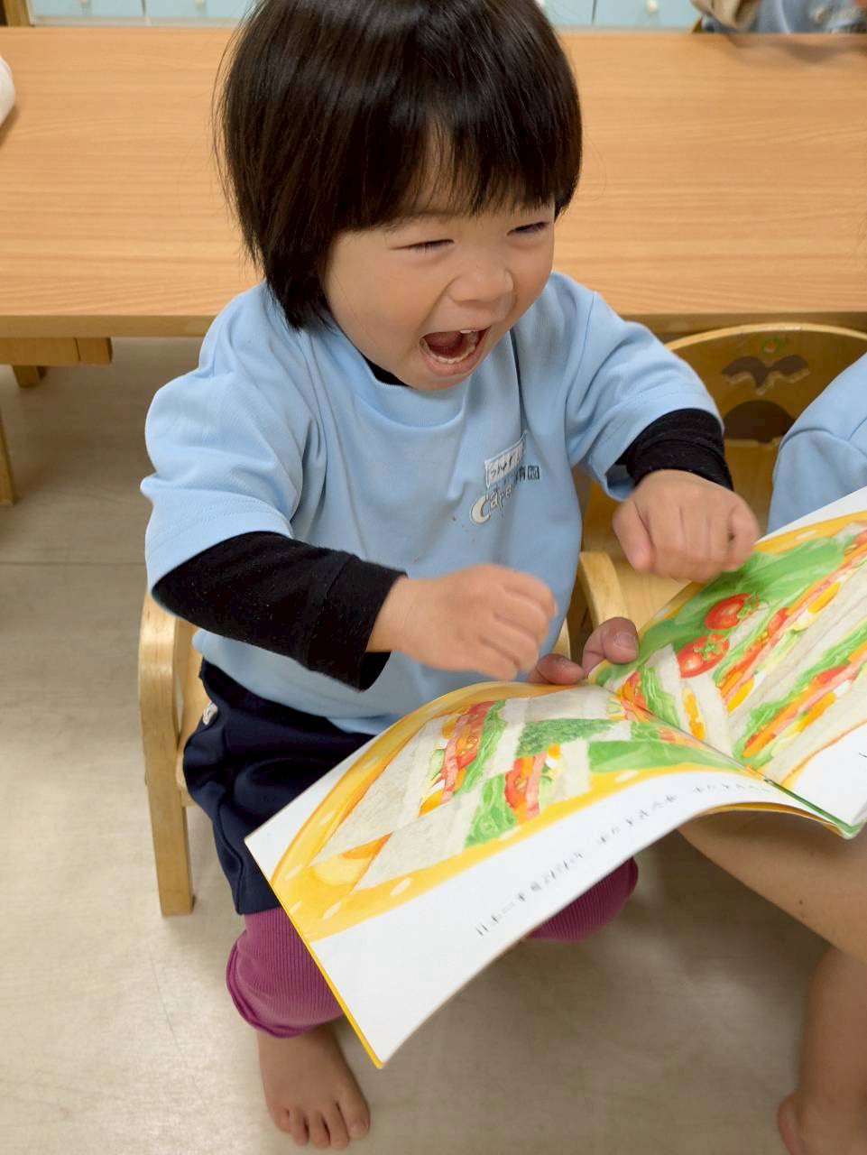 今日も大好き絵本の読み聞かせから保育がスタート📚💕見立て遊びを笑顔で楽しみ、食べる真似などの表現遊びを積極的にできていて、かわいい表情がたくさん見られました😍