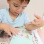 その後、ままごとで遊びながら、七五三👘の袋に装飾❗️好きな形の折り紙を糊付ける際、折り紙を押さえながら糊付けを❗️『すごい✨』❗️