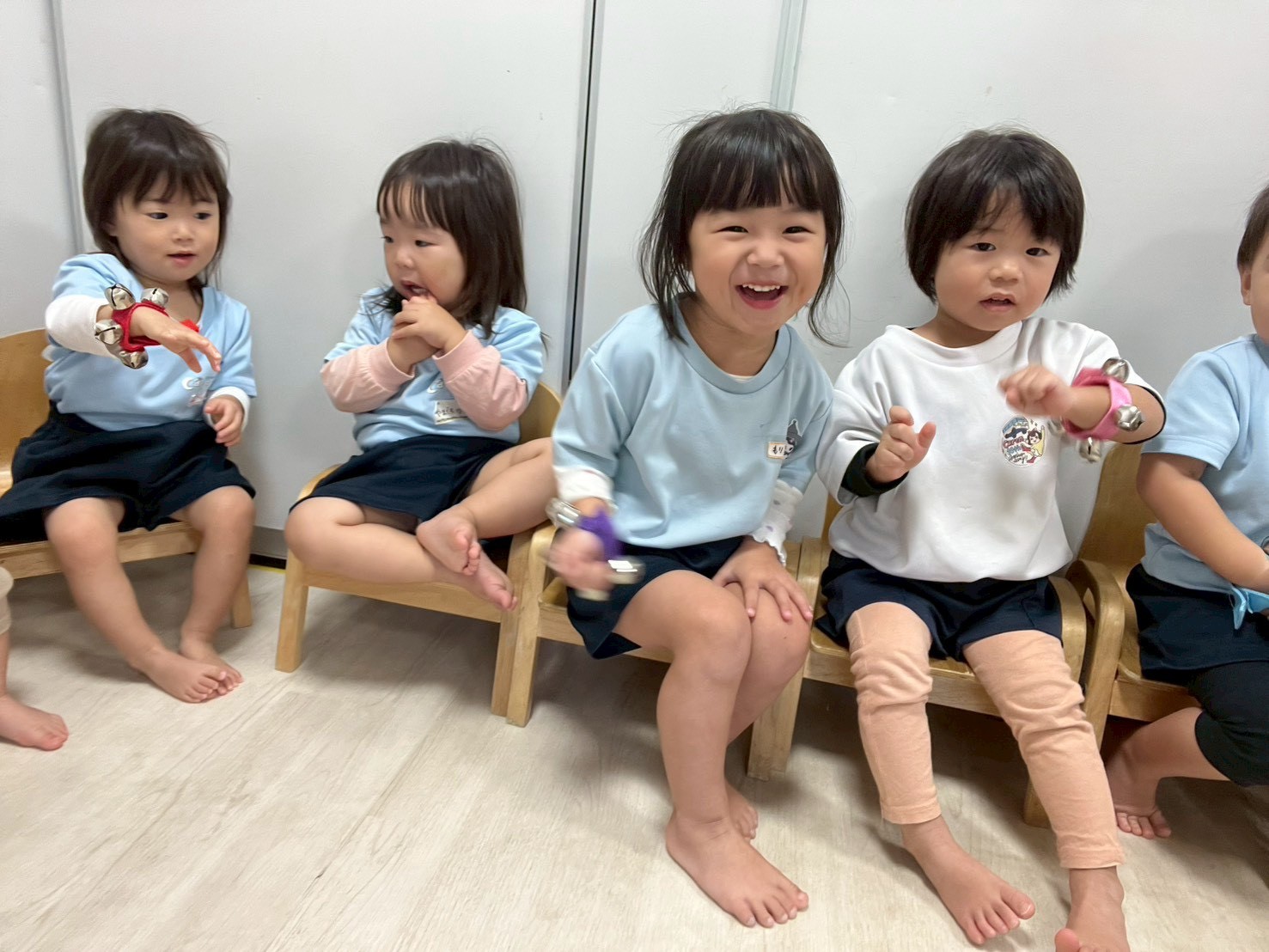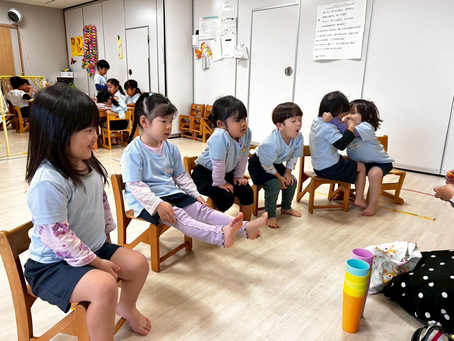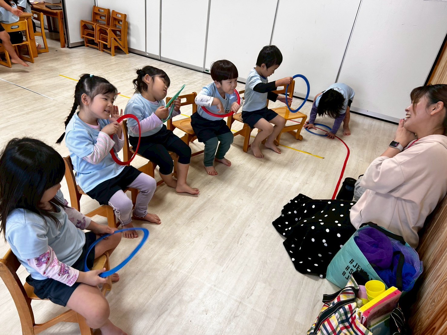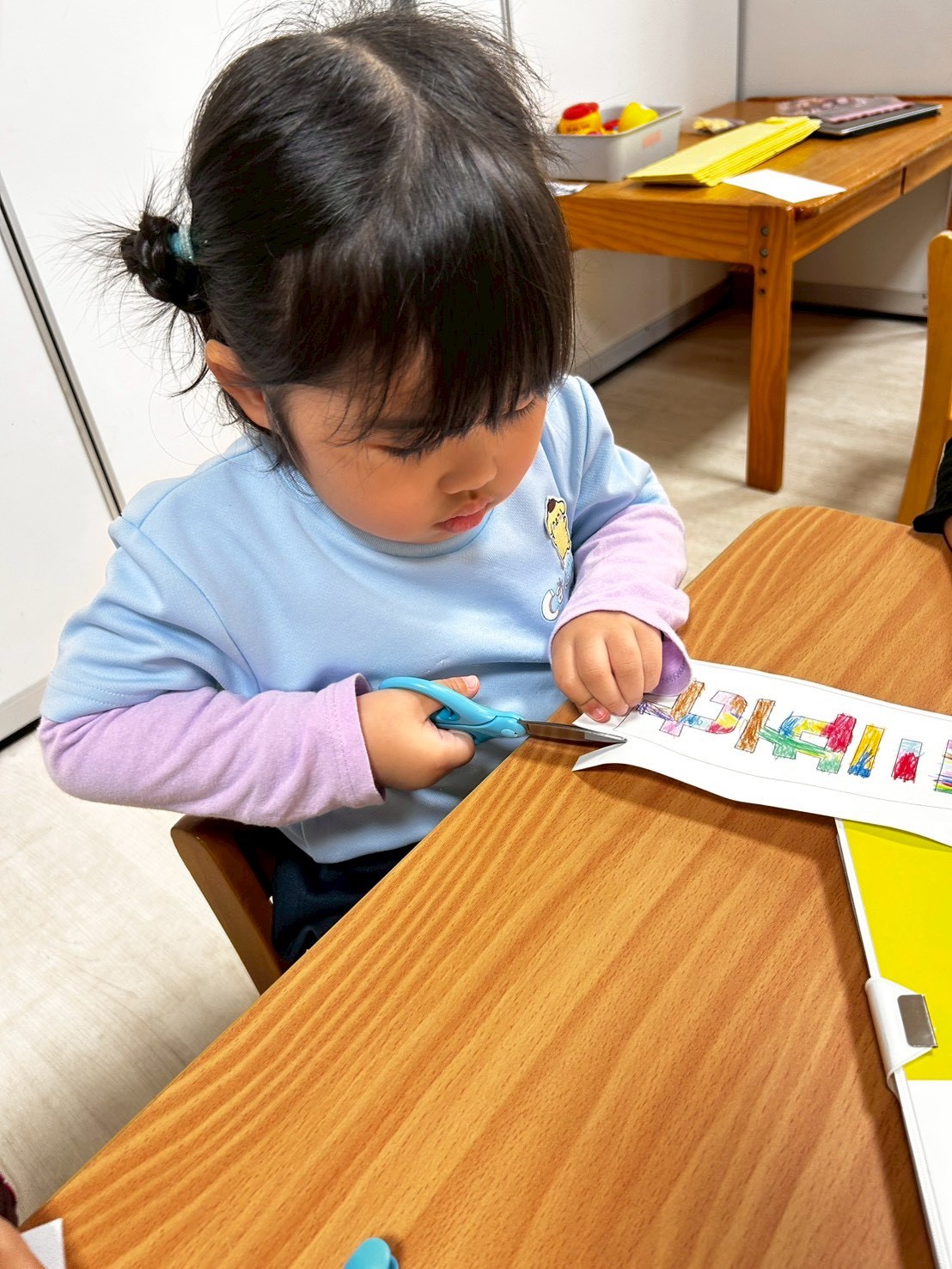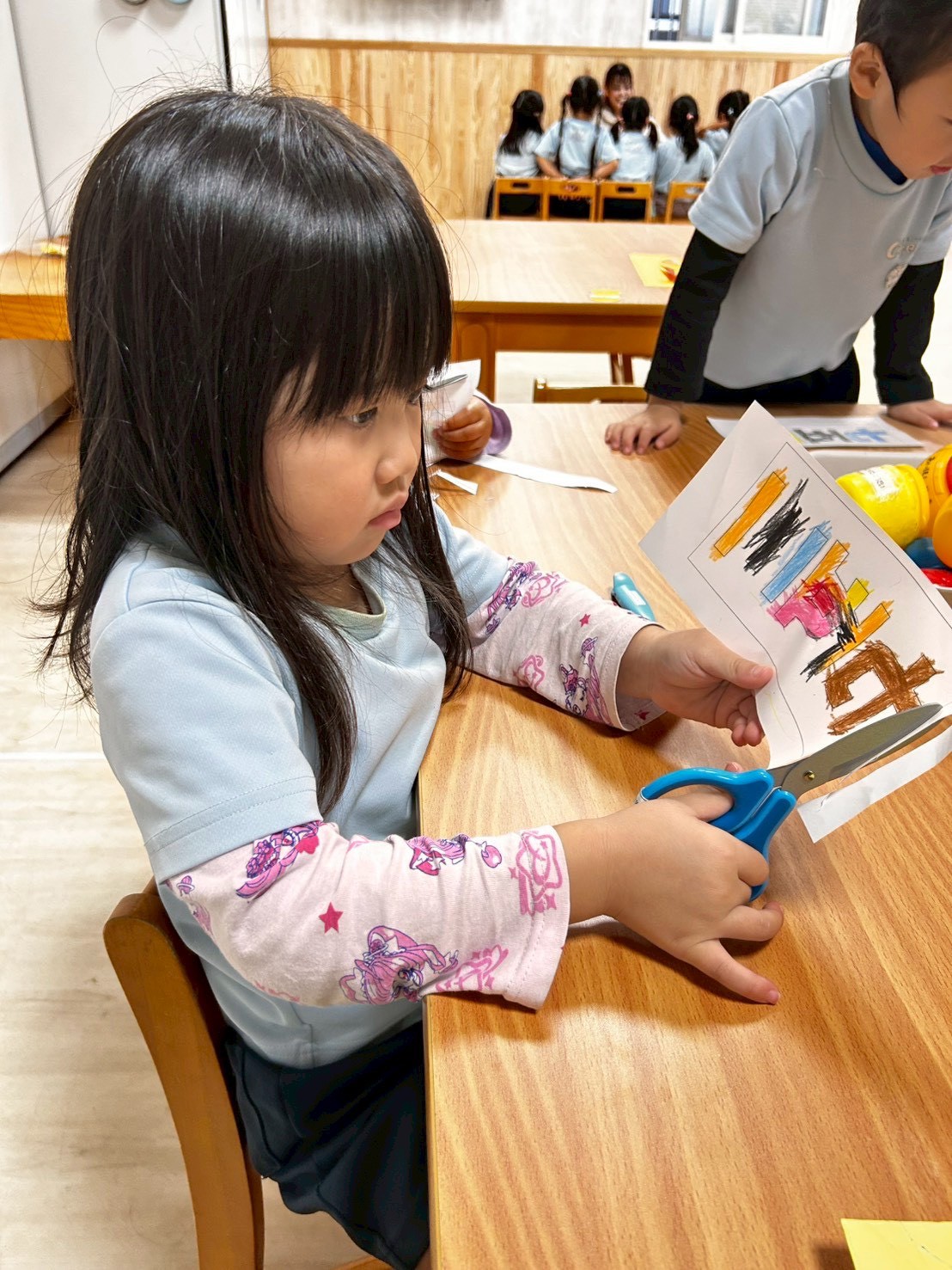 まゆみ先生のリトミック、みんな大好きで「あれがしたい!これががしたい!」が止まりません😆今日はその中でも腕につける鈴やフープ、紐通し、大きなシフォン布などでレッスンし、嬉しい・楽しいがいっぱいでした😍レッスンの待ち時間には七五三製作の続きをして、意欲いっぱいのうさぎ組さんは自分たちもハサミがしたいと初挑戦🌟お家でもしたことあるよ!と上手な子もいました✨カラフルな色付けとお花の飾り付けでかわいい千歳飴入れになりました🥰