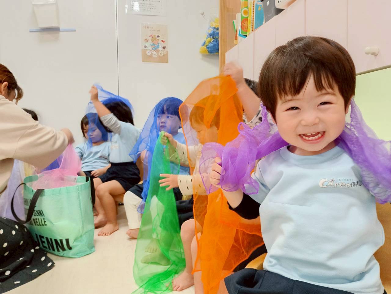 始まりからきちんと座って挨拶ができ、積極的に発言しながら絵本やリズムあそびを楽しみましたよ😍音の大きさの違いに興味を示したり、カラフルスカーフの色を口々に言いながらクリスマスソングでのリズム遊びを楽しんだりと、笑顔いっぱいで大盛り上がりの子どもたちでした💖