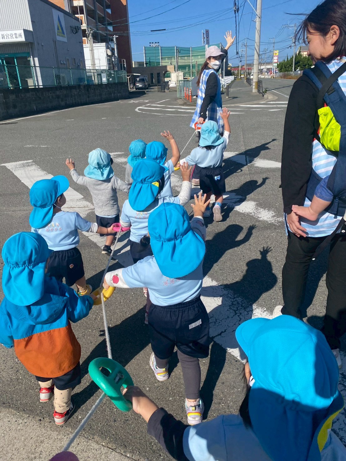通る車🚗やトラック🚚に手を振ったり歩道橋の階段を登り上から見る電車🚃に『あおー!きいろー!』と叫びながら手を振る子どもたち‼️