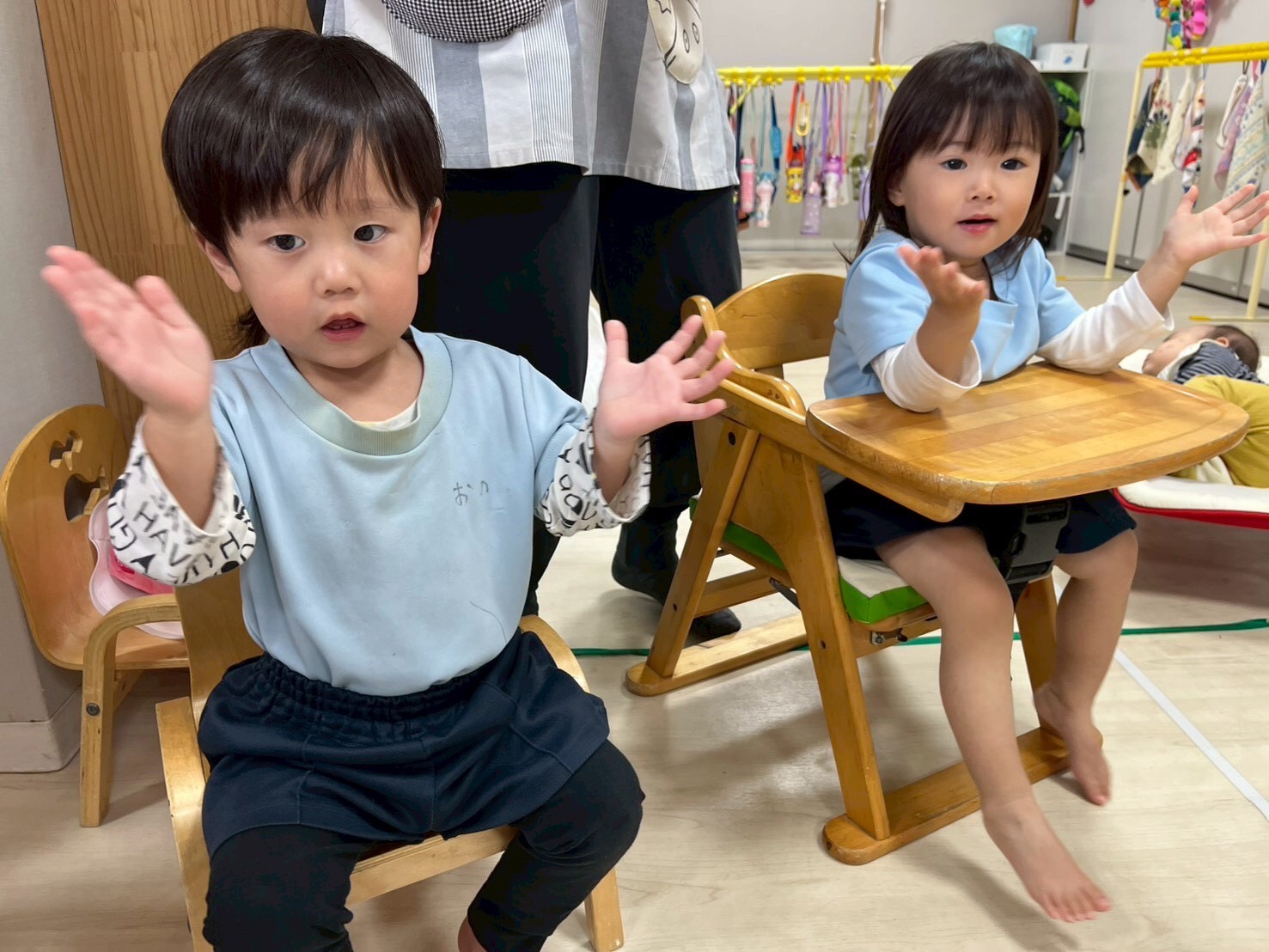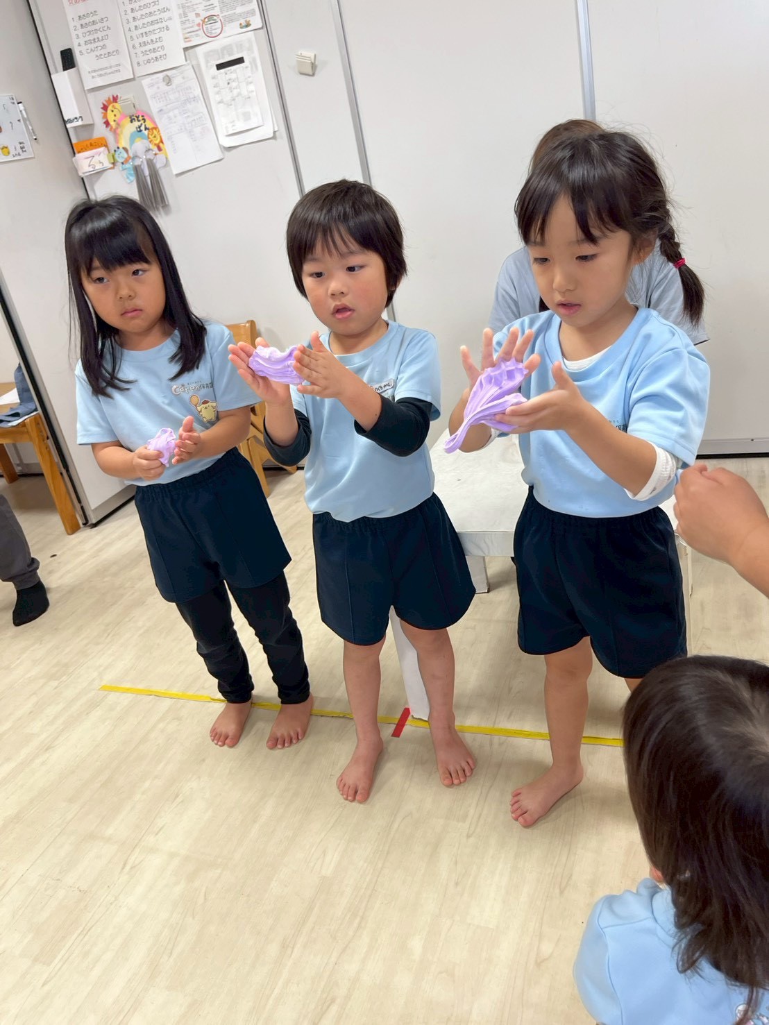先生の出し物のスライム作りや粘土作りにも興味を示して眺め、楽しんでいましたよ😍触感も味わい、大満足の様子のみんなでした💖ひよこ組さんはすやすや気持ちよさそうに眠っていましたよ😴💓ぱんだ組さんは来週月曜日の食育の話や持ってくるものについて確認する時間も作りました🍪