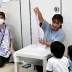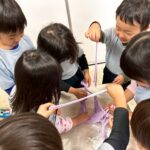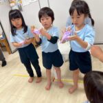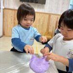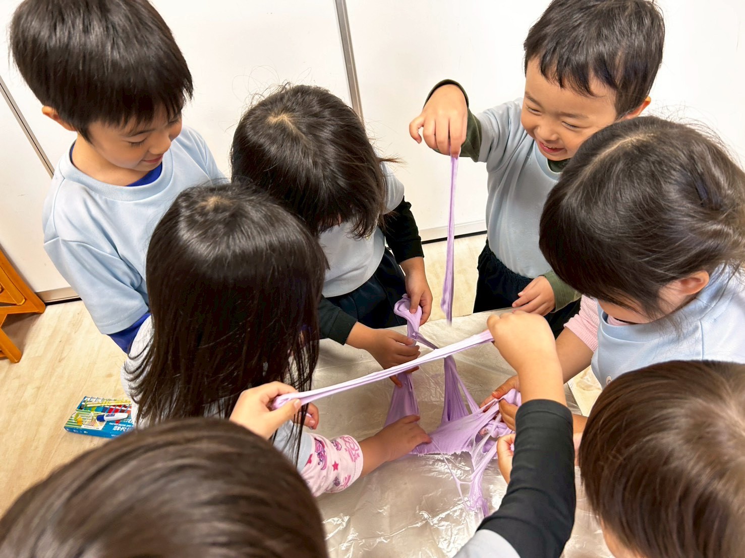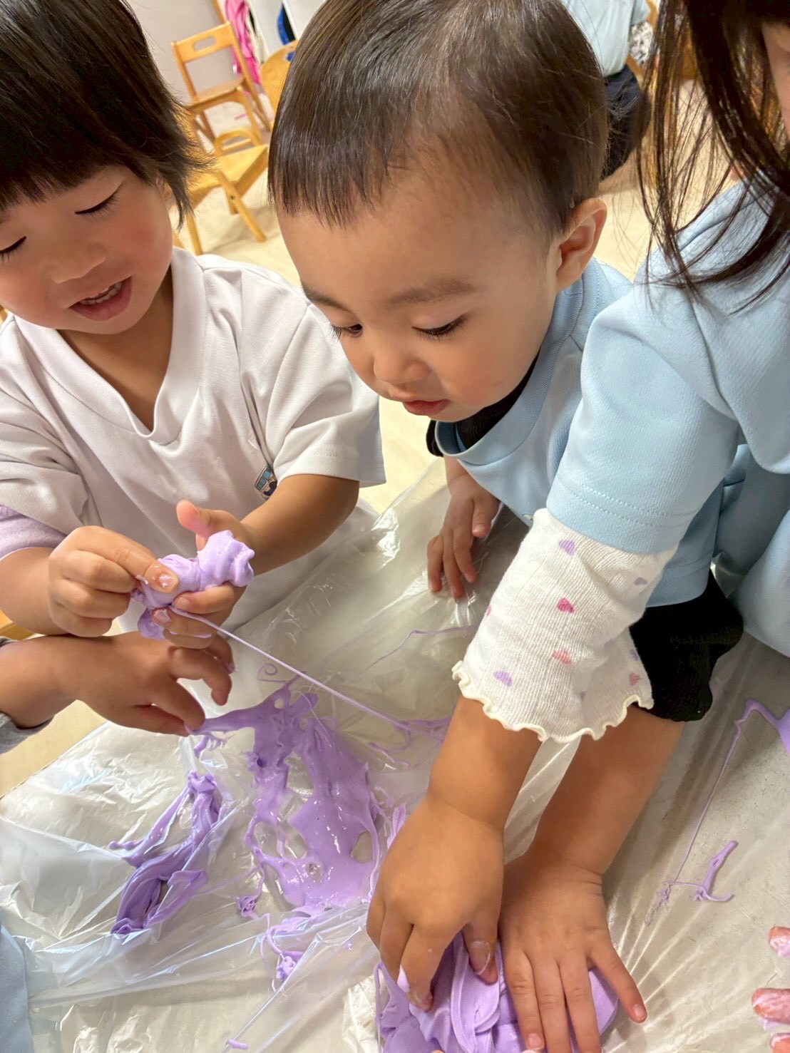 保育者からの出し物はスライムづくりで、みんなで協力しながら混ぜ混ぜ~❣プルプルとしたスライム、びよーんとのびるスライムが出来上がりました💕完成した後はみんなで順番に感触を楽しみましたよ🥰