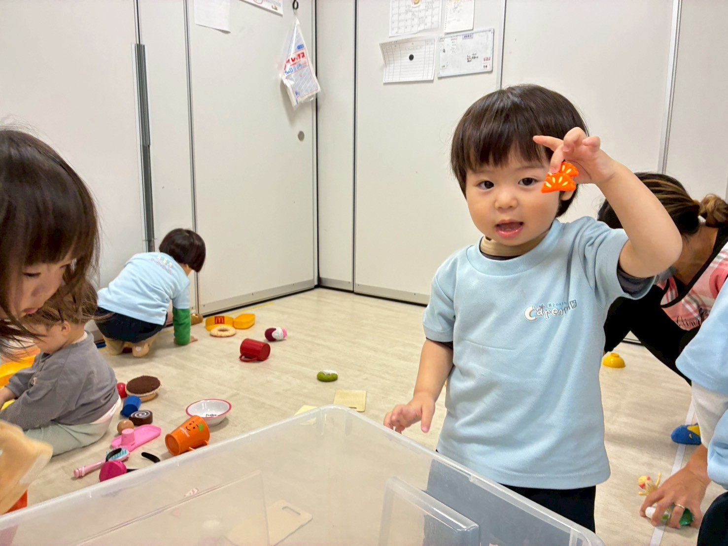 お皿をたくさん並べてご飯を作ったり、コップの中に物を隠してどっちでしょ😁と隠して遊んだり思い思いに楽しんだリスさん、ひよこさんです🥰