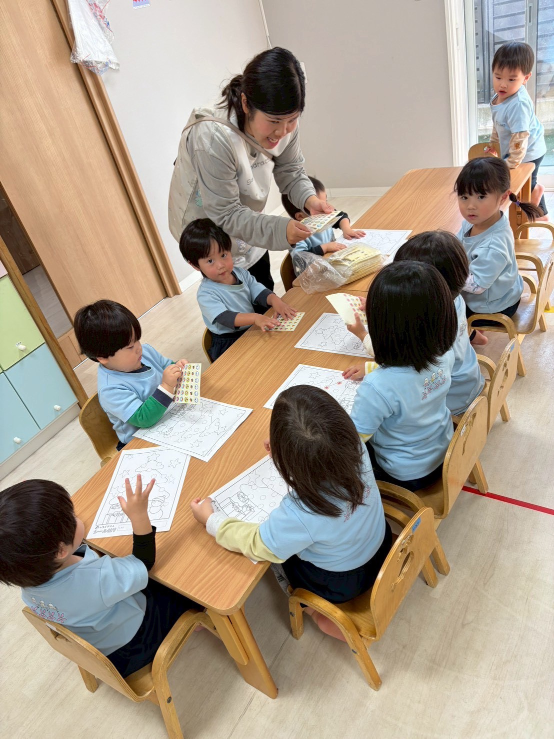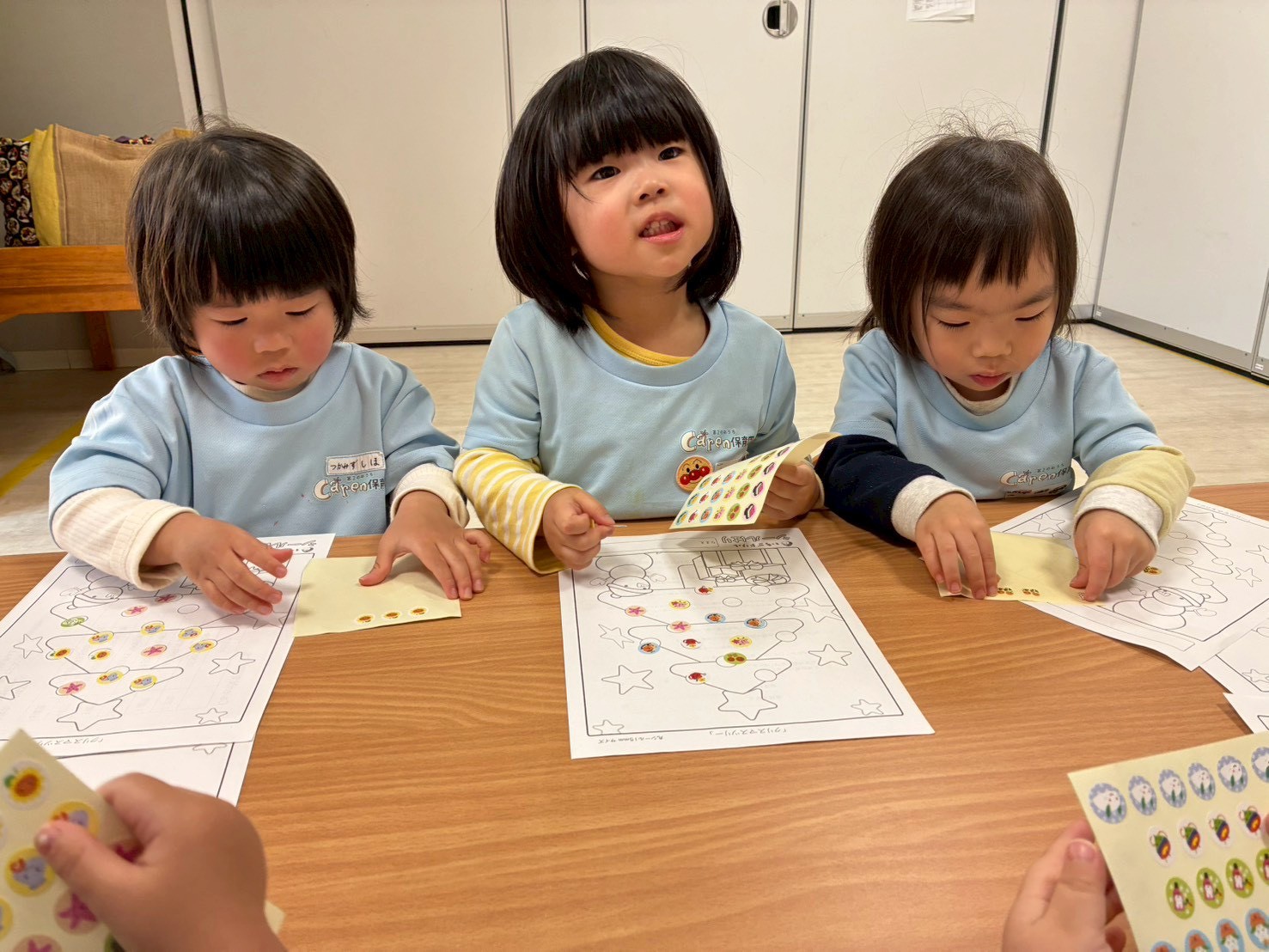 歯科検診後はクリスマスに向けてクリスマスツリーのシール貼りをしました🎄🌟シールの丸に合わせて上手にシールを貼れている子も多く、「ママに見せる〜パパに見せる〜」と張り切っておりました🤭💗良かったらたくさん褒めてあげてください🤗❤️給食はみんな大好き唐揚げで、笑顔で頬張っていました😋【うさぎ・こあら・きりんぐみ】