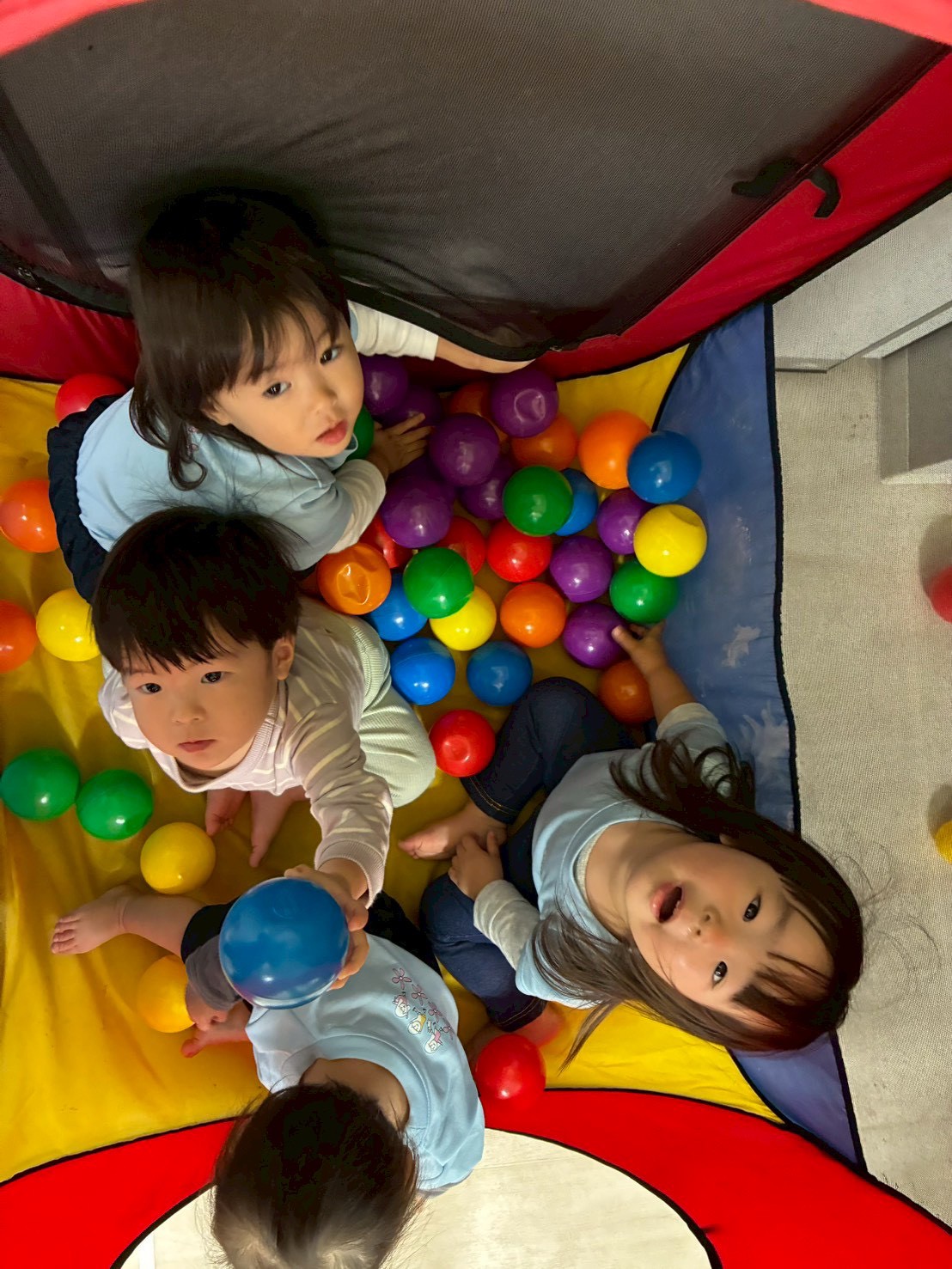 「ういーっ」「ほいっ」など言いながら競い合ってボールを投げていました🎵ボールハウスで足をバタバタさせたり、サッカーしたり、転がるたくさんのボールを追いかけてハイハイしたりとみんな自由にのびのびと遊んでいました🥰疲れたのか、その後の歯科検診では泣く子も少なかったです。今日もよく遊びよく笑いました🤭【ぱんだぐみ】