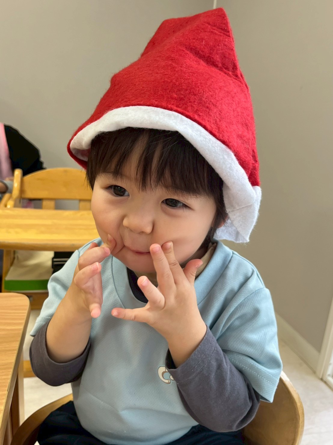 その後の英語レッスンでは、サンタさんに変身したりしながら、身体の部位や英単語カードを積極的に発語していました🌟🎄チャリナ先生の英語を聞いて、きちんと理解できるようになっていて、ほんとにすごい🤩✨たくさん褒めてもらえていましたよ✨