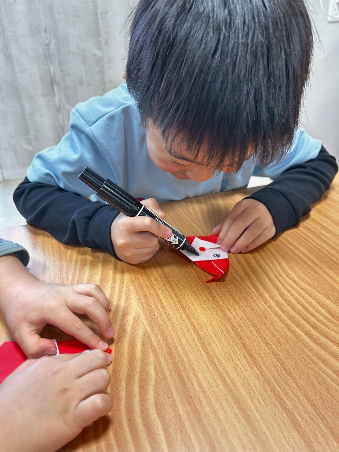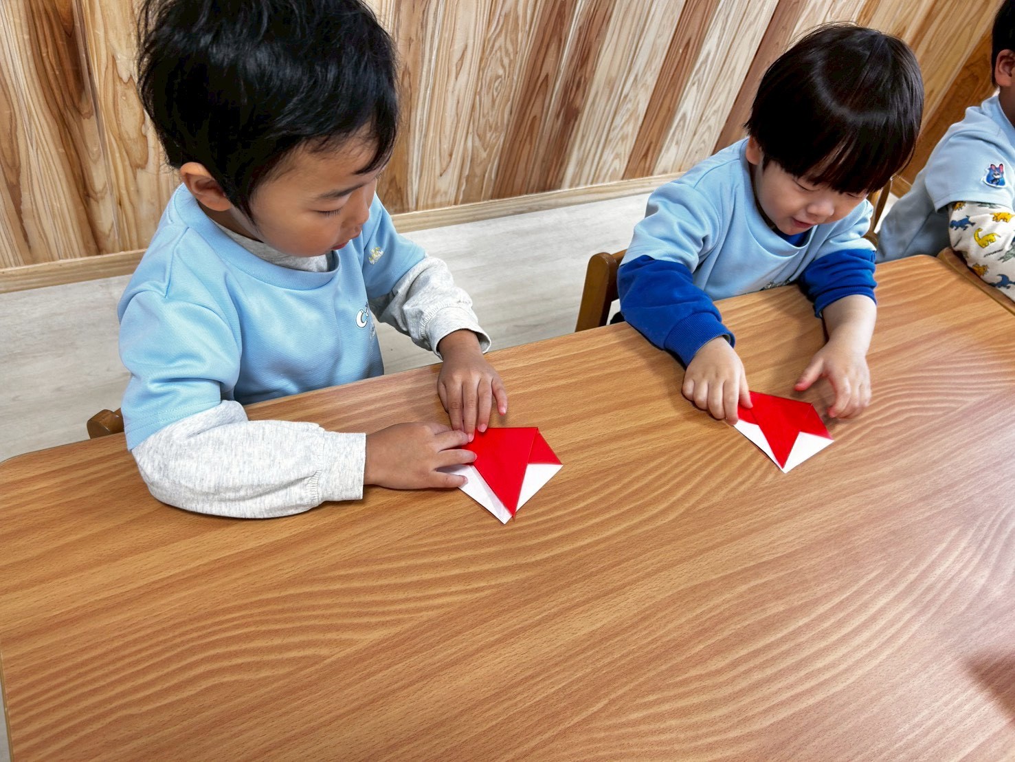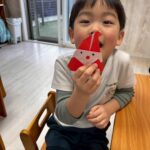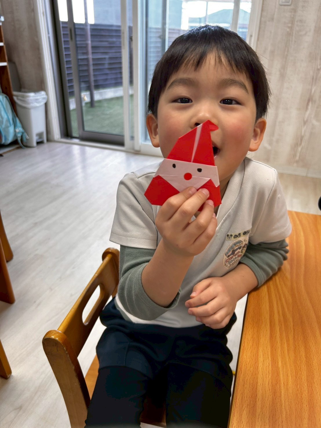 今日はバルバルさんのお話を読んだ後、クリスマスにピッタリなサンタクロースを折り紙で作りました🎅きりん組さんは「次はこうするんじゃないかな?」などと完成したものを見ながら考えることも出来ていてさすがだなと思いました😌✨鼻のシールも貼って、目も描いて完成👏💕持ち帰っていますので、よかったらお家に飾ってくださいね💖