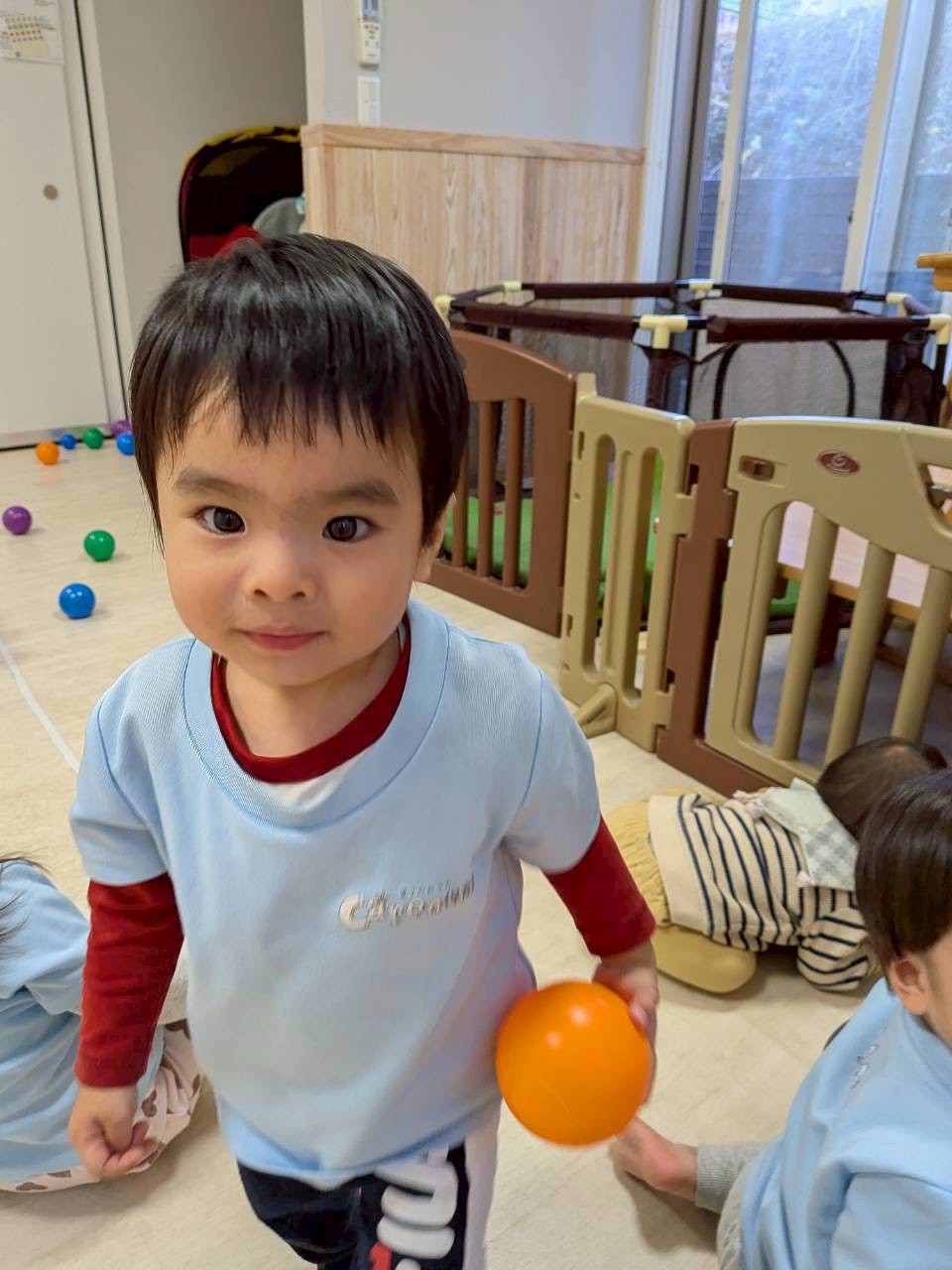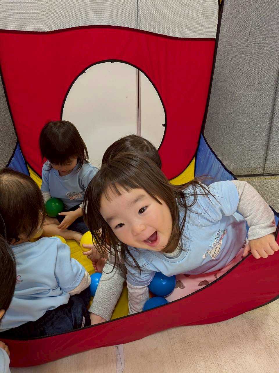 好きな色のボールを見つけて両手に持ち見せてくれたり、「えいー😆」と言いながらボールを投げたり、先生にボールを持ってきてくれたり、笑顔がたくさん見られました😊