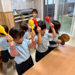 その後、1月の製作をして楽器遊びをしました(楽器)今回は打楽器を中心に、演奏しましたよ🎶様々な曲に合わせて、途中で楽器を交代しながら何度も演奏しました😆そろそろ終わろうかと話すと「やだー😣まだしたーい❗️」とやる気満々でしばらく演奏会は続きました💕こんなにも音楽を楽しめるとは思わず、小さな演奏家の誕生という感じでした🌟