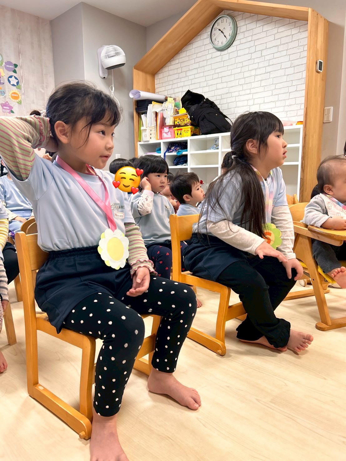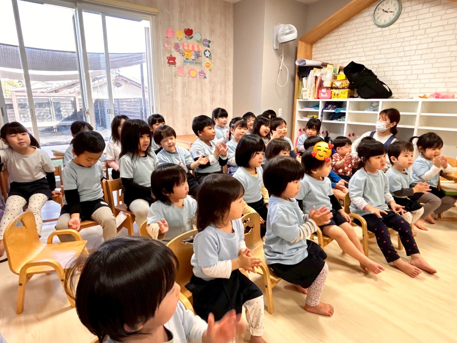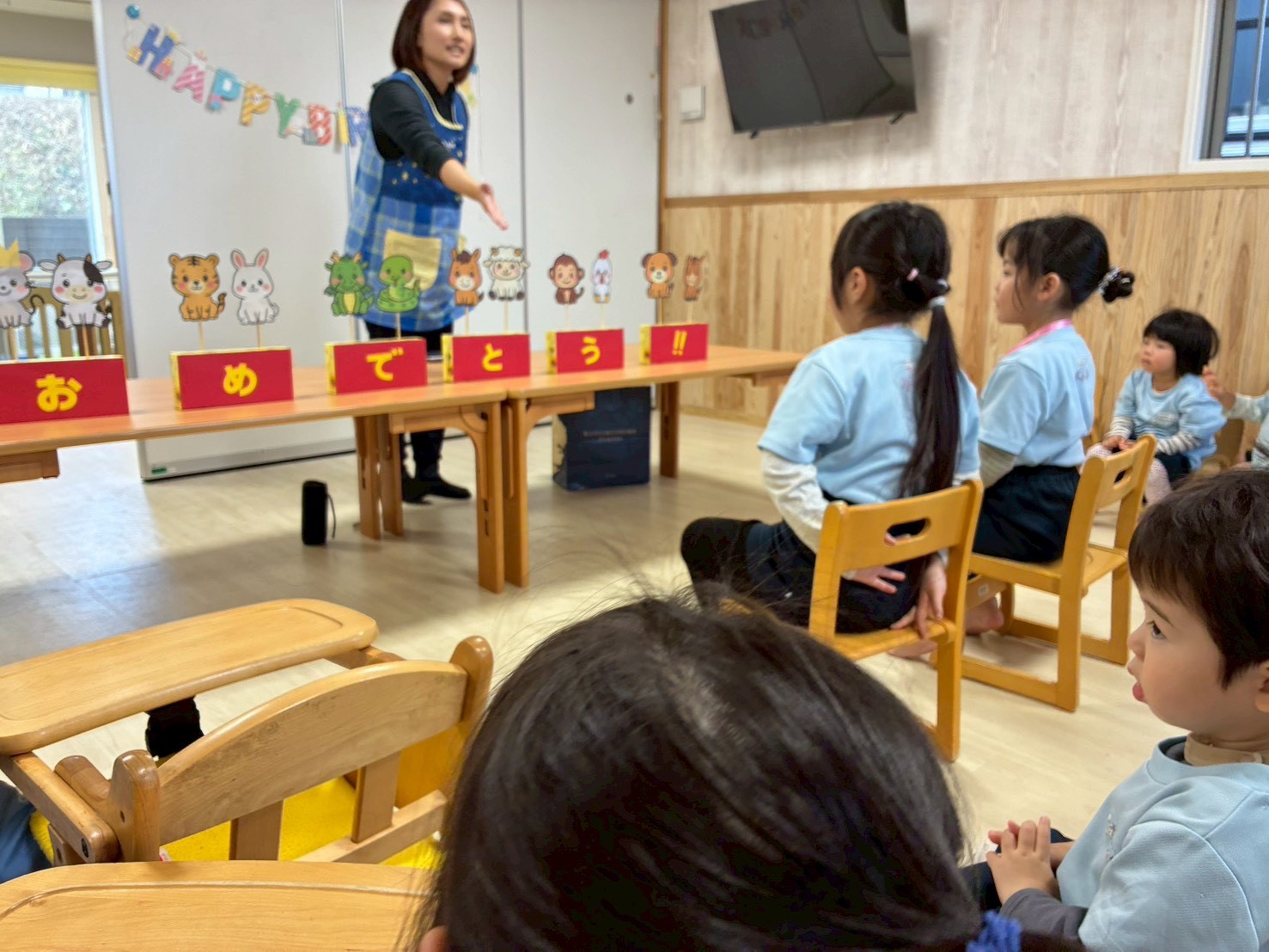 その後は1月生まれのお誕生会🎂きりんぐみから2名、ひよこ組から1名の誕生日のお友だちのお祝いをみんなでしました💖✨保育者からの出し物は新しい1年がスタートしたということで十二支のお話しのペープサートでした🐭お正月の動物たちのリレー、順番を覚えている子もいて動物の名前を答えながら楽しんでいました🥳