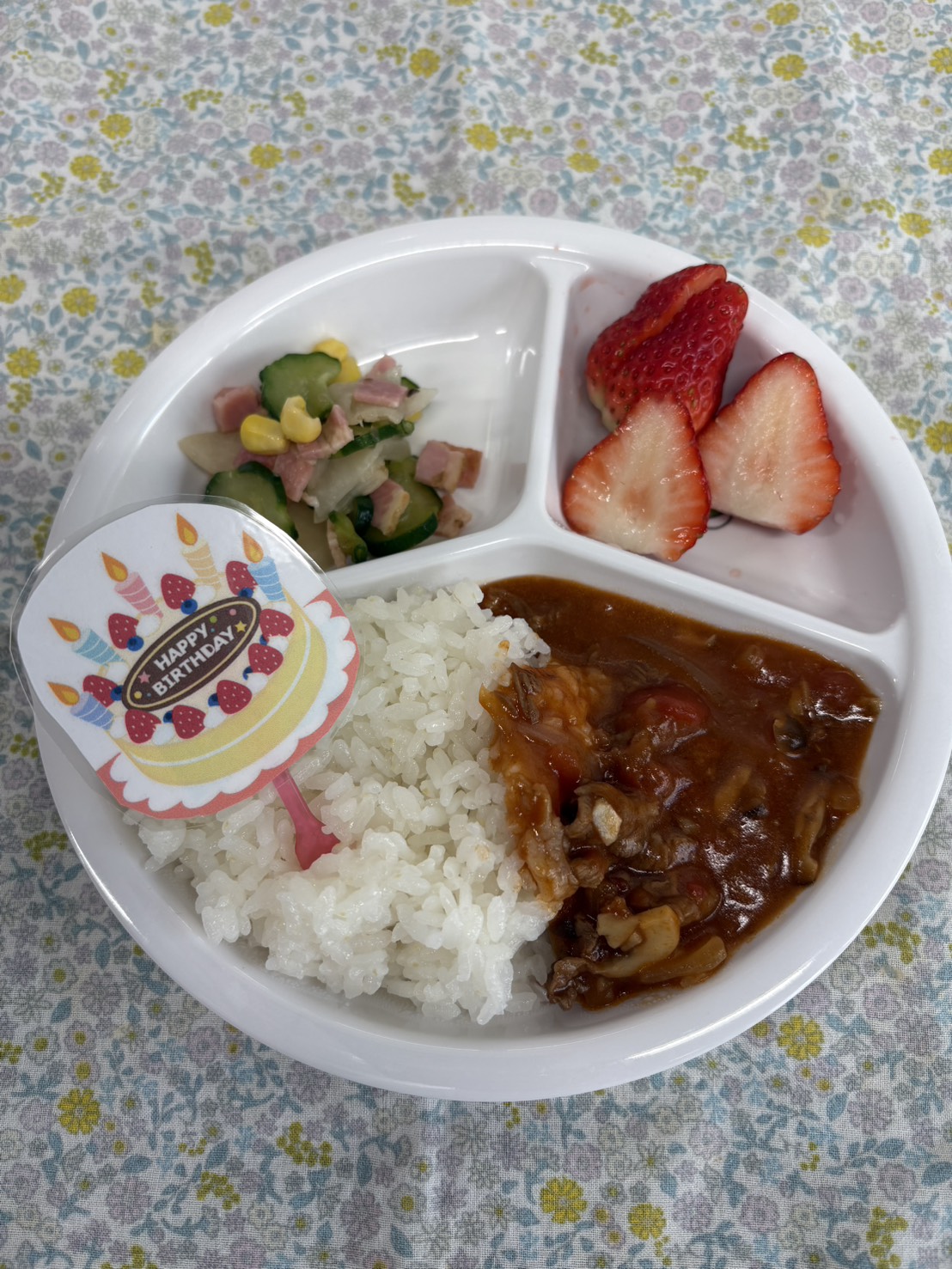 誕生会の後は園庭で遊びました🤗砂場の砂遊びではお餅を焼いている子もいて、家庭での様子が伺えました🤭すると給食室からのいい匂いが園庭にもしてきて「お腹すいた〜」のコールが止まらず少し早めの給食タイムとなりました😋デザートにいちごもあり、とっても嬉しそうでしたよ🍓