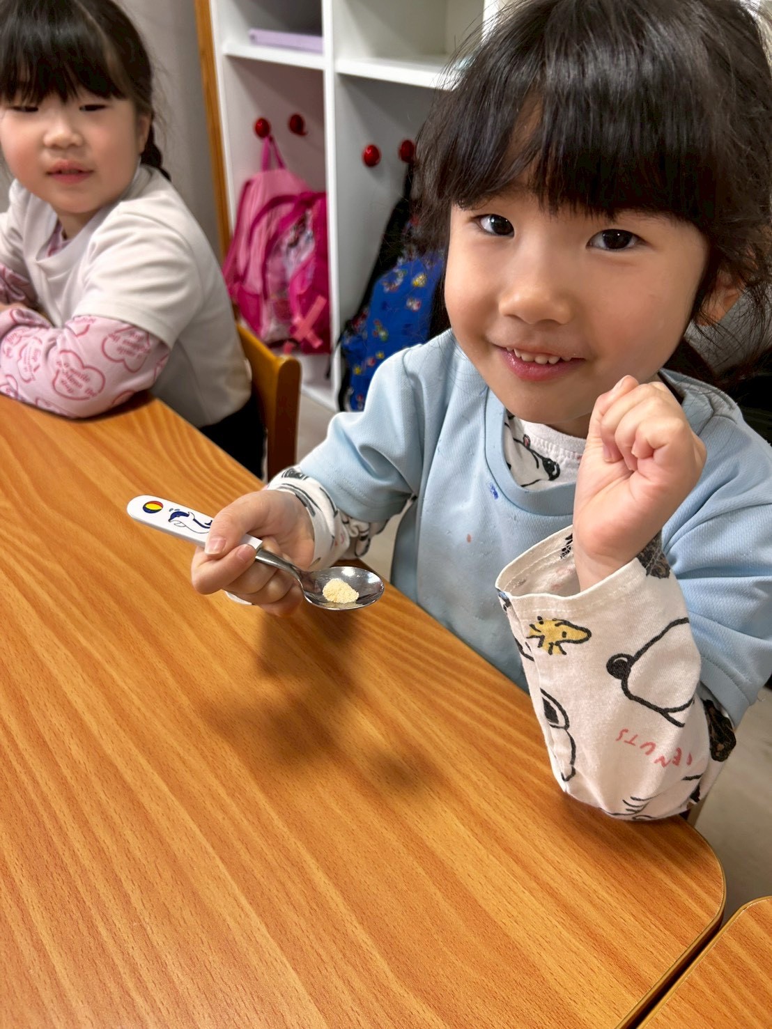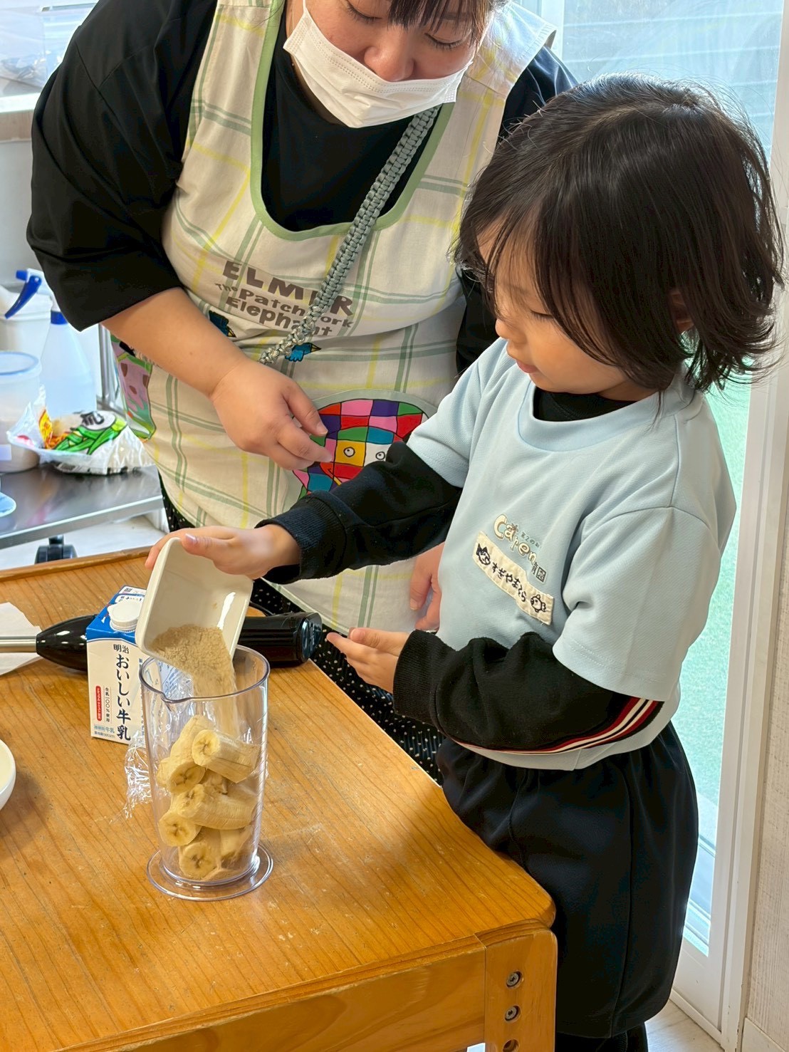 みんなが好きなジュースにも砂糖が沢山含まれているんだよということで、あまり砂糖をあまり使わないジュースをみんなで作り試飲しました☺️💕バナナと少量のきび砂糖をブレンダーかけて、牛乳伸ばして完成🌟美味しく仕上がり子供たちにも好評でした💯