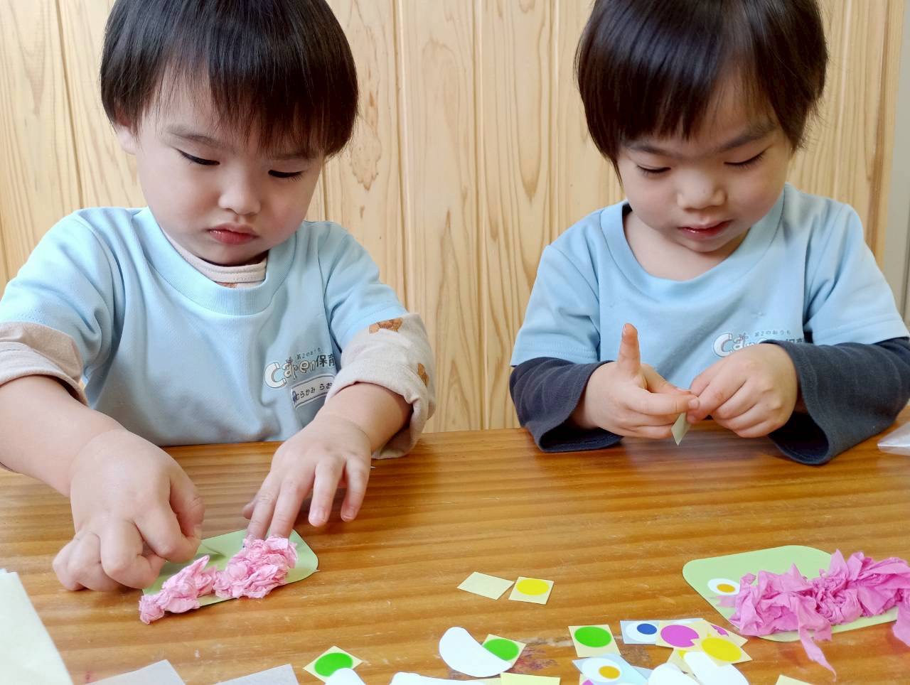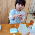 好きな色を選び花紙をクシュクシュして髪の毛に。